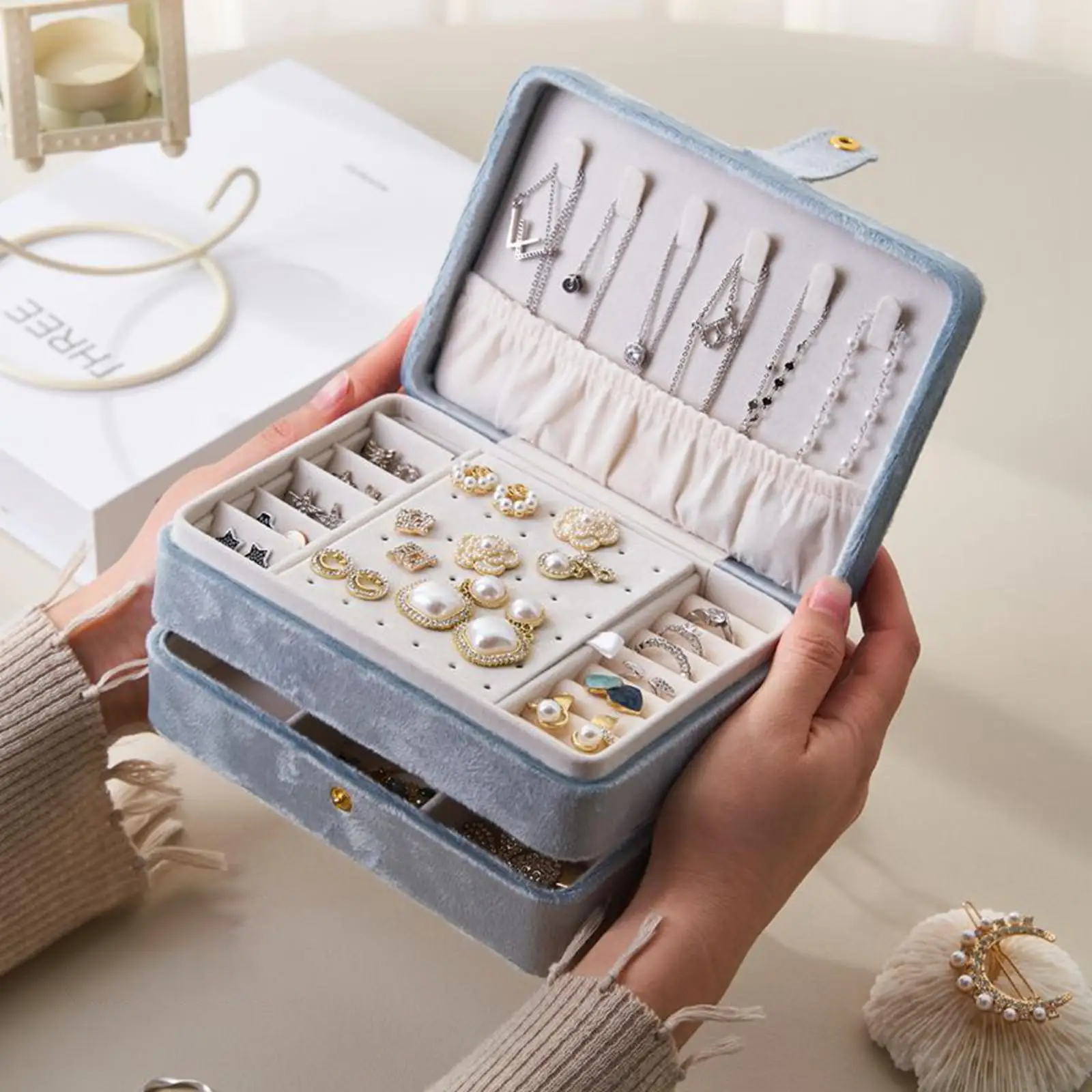 équipée de séparateurs amovibles pour un stockage flexible des bracelets, du rouge à lèvres, des boucles