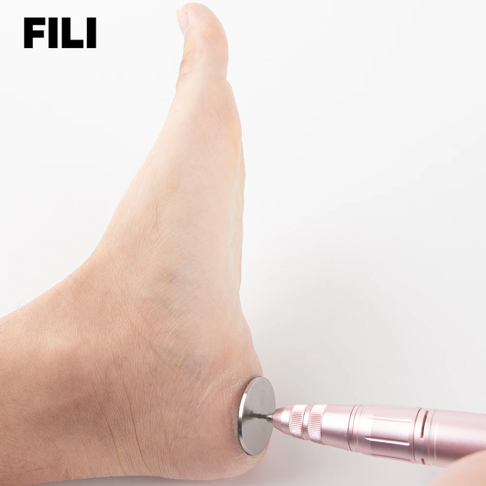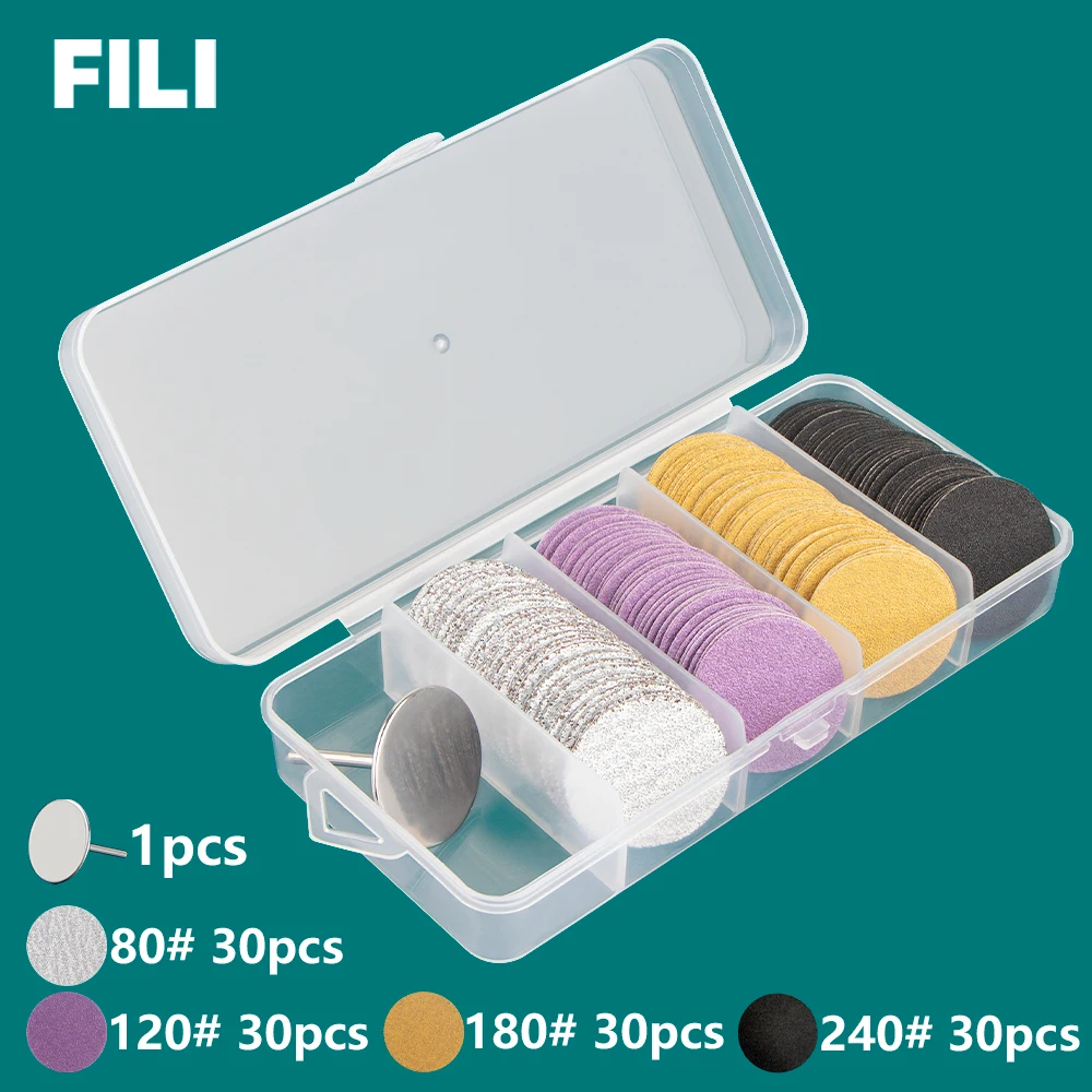 Ensemble de pédicure pour l’élimination des callosités des pieds. Ce kit comprend des disques de papier de verre de différents grains et un disque de pédicure en métal. Le résultat est une peau lisse et douce.