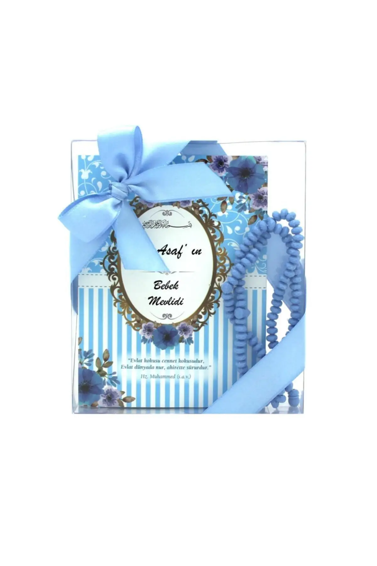 Cadeau musulman Asaf Cadeau nommé Paquet Mevlüt pour hommes Livre Yasin, chapelet parfumé et coffret en acétate Bleu Hajj Umrah Quran