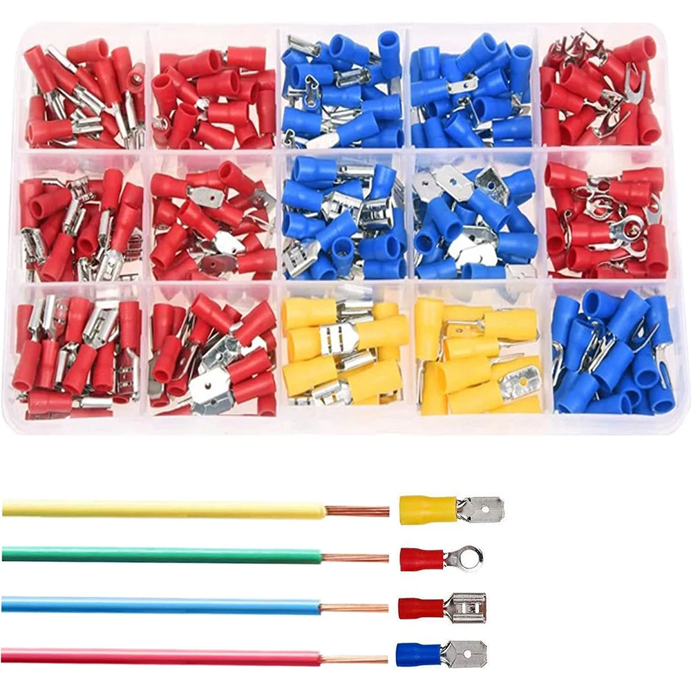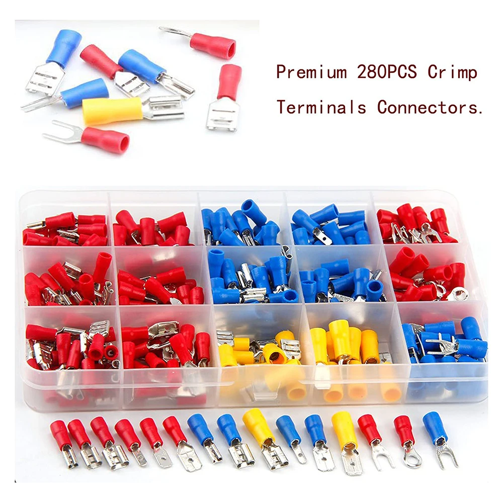 Vous recevrez 280 pièces de connecteurs à sertir dans 15 des tailles les plus courantes. Gamme: 2.8mm, 4.8mm, 6.3mm. Y compris les connecteurs mâles et femelles de bêche, connecteurs de bêche, connecteurs d’anneau.