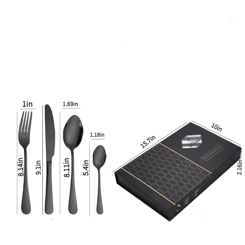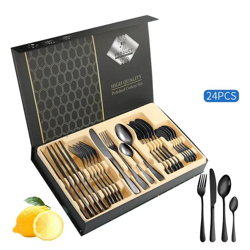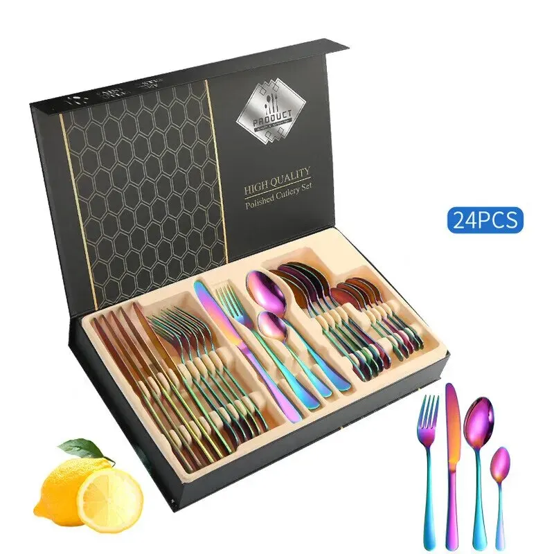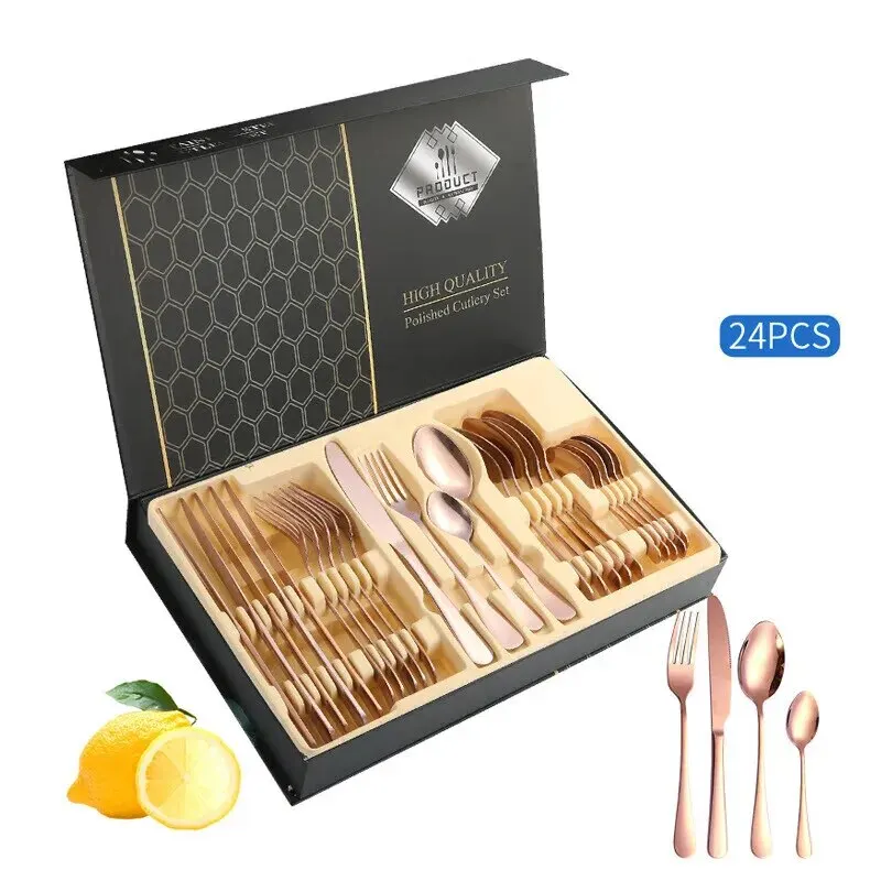 Voici les points importants à retenir de l’ensemble d’argenterie en or avec boîte, couverts en acier inoxydable, cadeau de couverts chauffants, couteau de cuisine, 007, 16/24 pièces :
