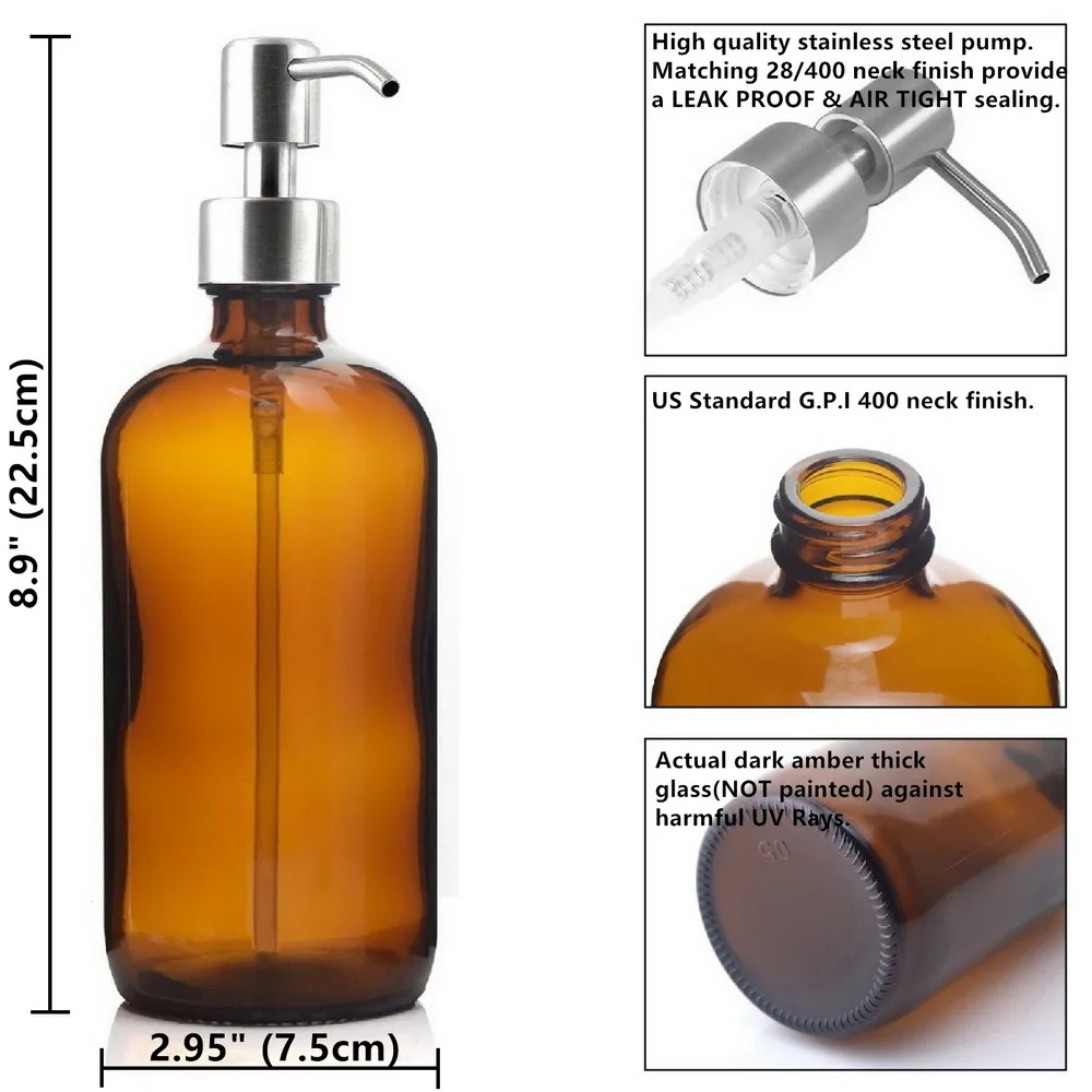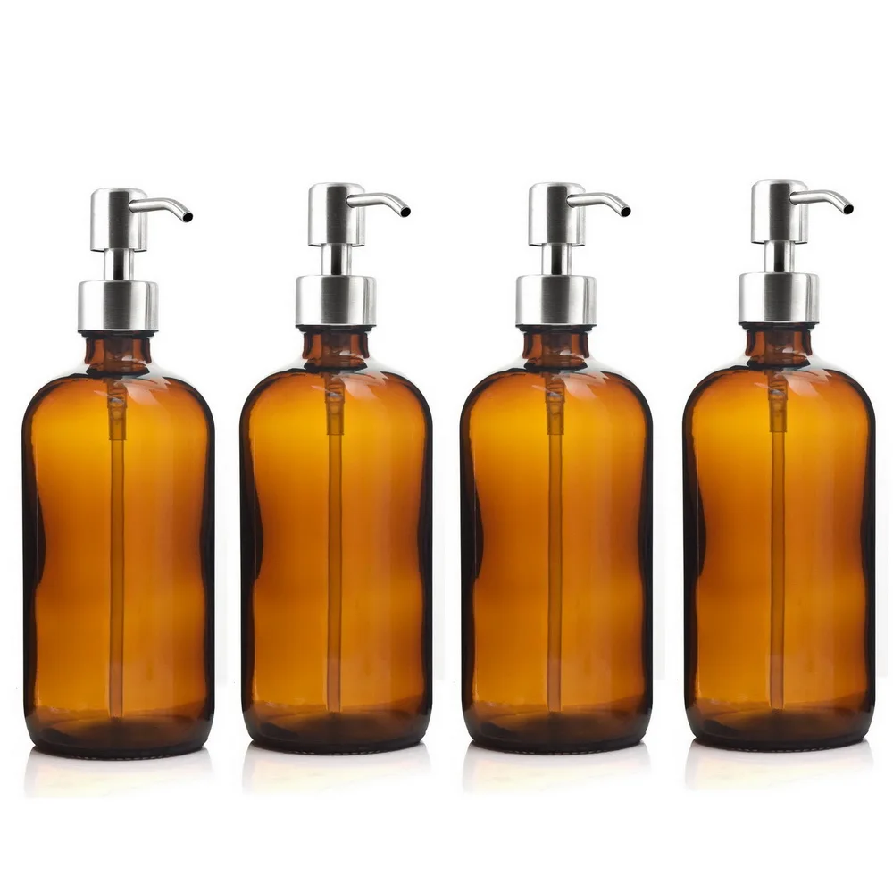 - Ensemble de 4 bouteilles durables en verre ambré de 16 oz(500ml) chacune, avec des pompes en acier inoxydable.