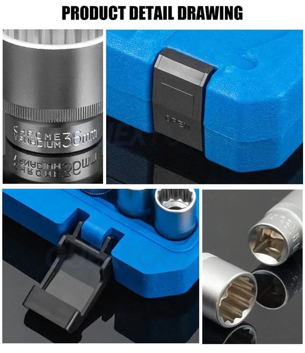 Ce produit est un ensemble de 21 douilles Torx hexagonales de 8 à 36mm. Les douilles sont fabriquées en matériau de haute qualité (CR-V), ce qui garantit leur durabilité et leur longévité. L’outil principal est un cliquet, ce qui le rend très pratique pour effectuer des réparations automobiles. Les douilles sont spécialement conçues pour les espaces restreints du compartiment moteur des voitures. Elles sont adaptées pour le démontage des angles à quatre coins, hexagonaux et à 12 points. Les douilles sont compatibles avec les tailles métriques et en pouces. De plus, grâce à leur forme spéciale, elles peuvent être utilisées même lorsque la fixation de la tête est usée, permettant ainsi de desserrer les écrous et les boulons. En cas de problème avec l’utilisation du produit, vous bénéficiez d’une garantie de satisfaction à 100% et vous pouvez contacter le vendeur pour résoudre le problème.
