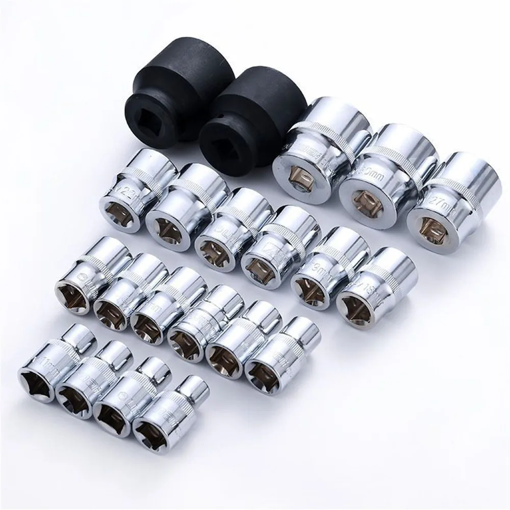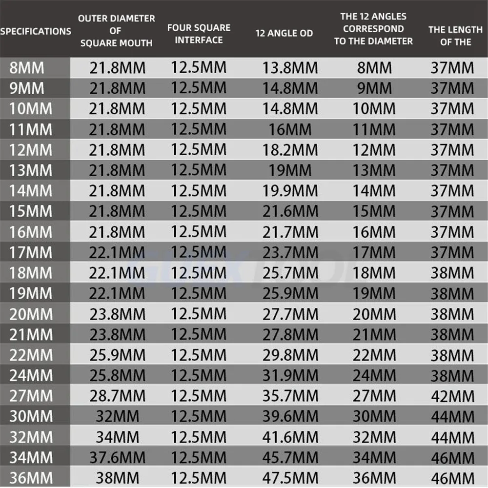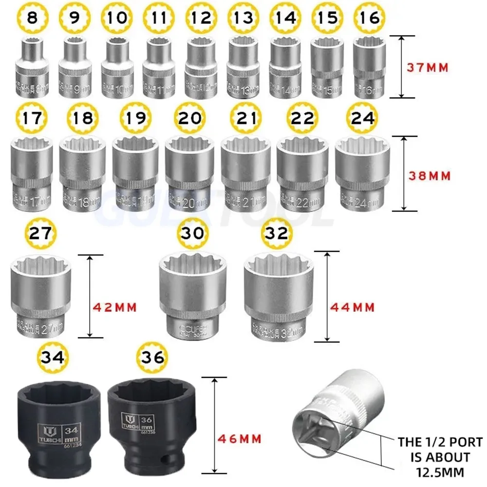 Les différentes tailles de douilles incluses dans cet ensemble sont : 8, 9, 10, 11, 12, 13, 14, 15, 16, 17, 18, 19, 20, 21, 22, 24, 27, 30, 32, 34 et 36mm.