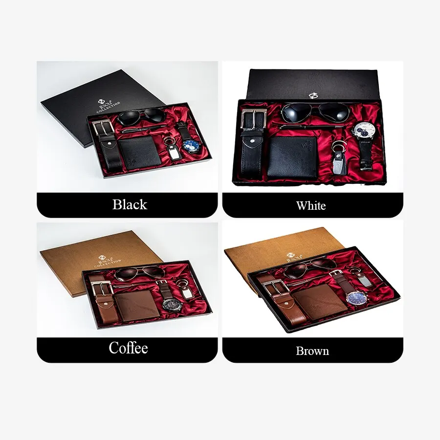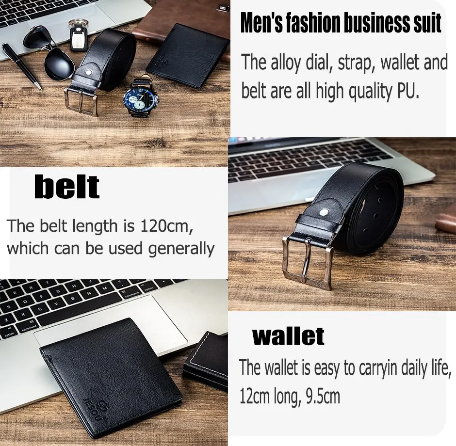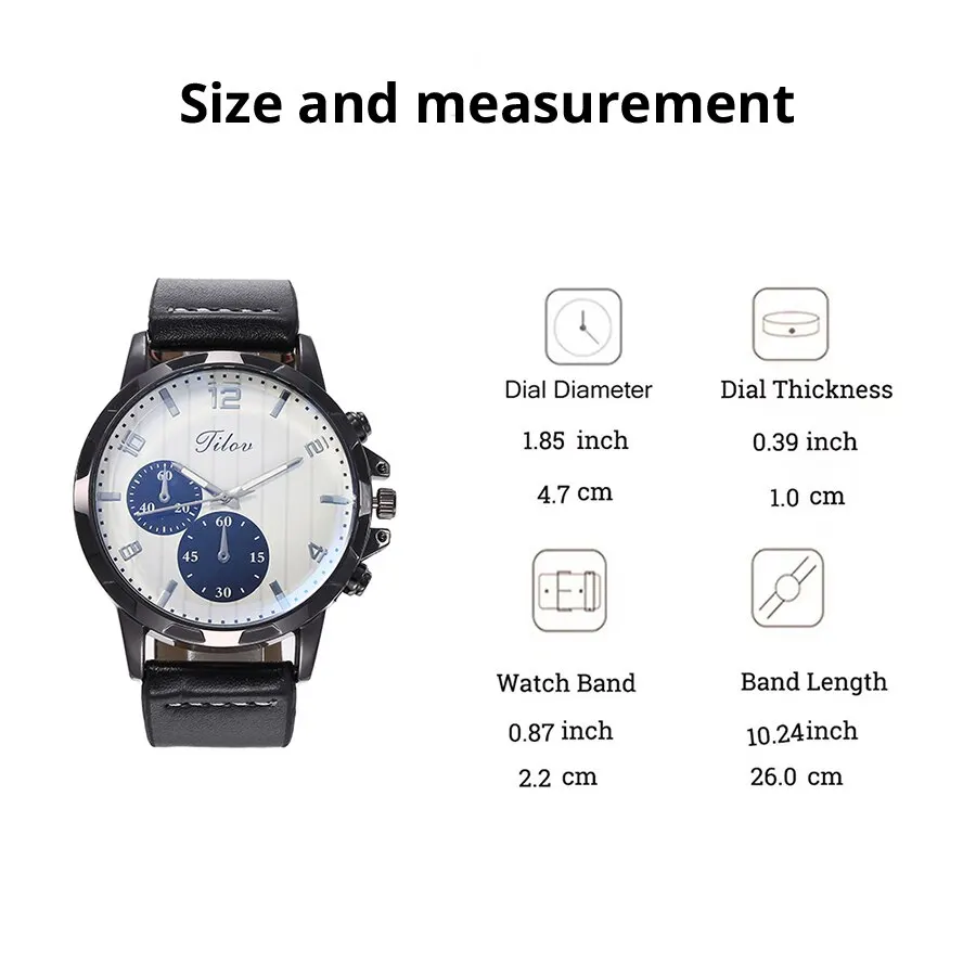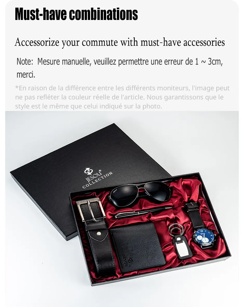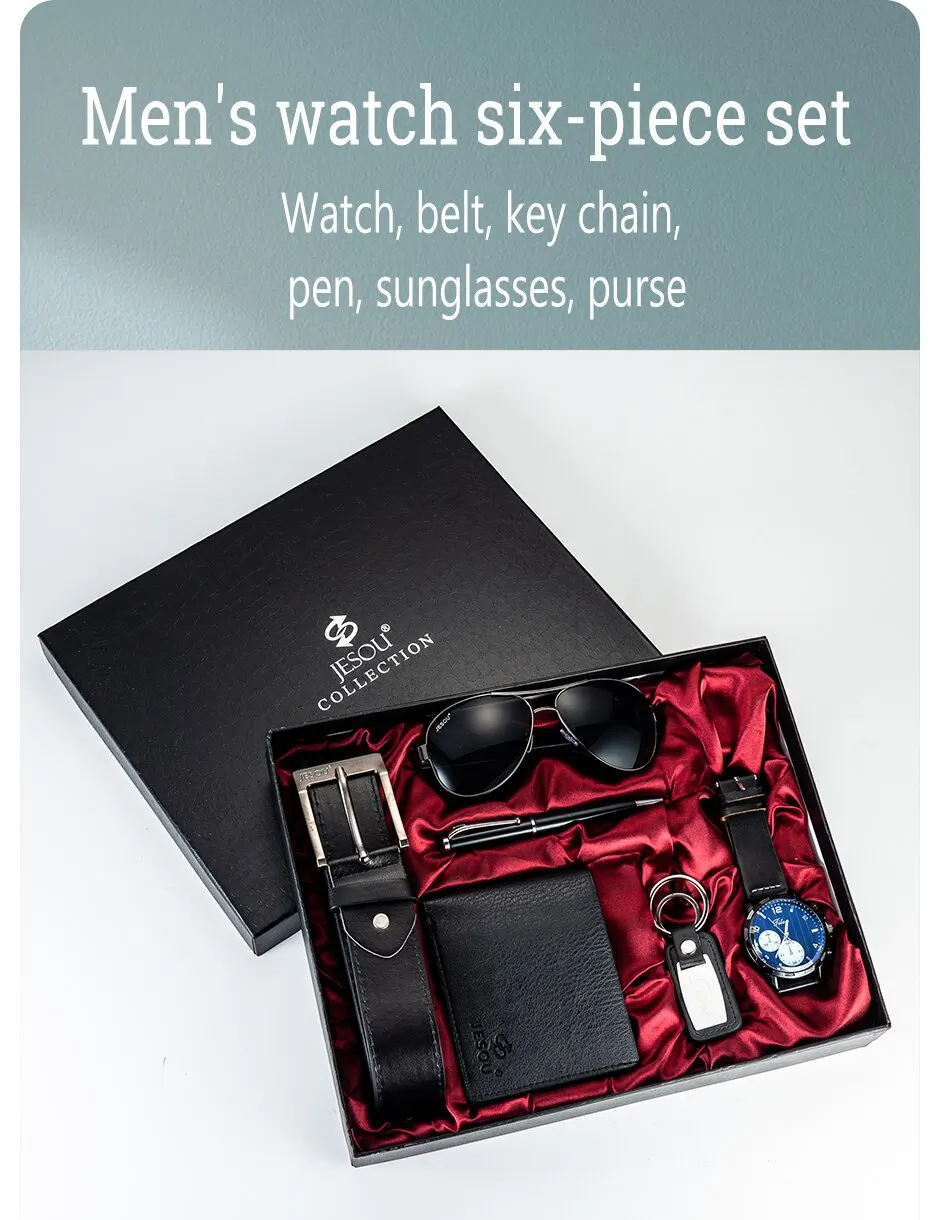 | Ce produit combine une montre, des lunettes, un stylo, un porte-clés, une ceinture et un sac à main en un seul ensemble, ce qui en fait un accessoire polyvalent pour toute occasion. | Le design élégant et élégant de ce produit en fait un ajustement parfait pour les environnements professionnels et les occasions spéciales. | Le mouvement à quartz assure un chronométrage précis, rendant ce produit fiable et pratique. | Le bracelet en cuir est confortable à porter et ajoute une touche de sophistication à l’aspect général. |