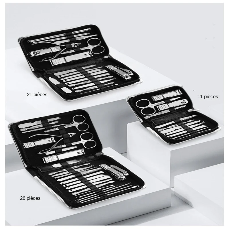 La différence réside dans le nombre d’outils inclus dans chaque ensemble. L’ensemble de 11 pièces comprend les outils de base tels que les coupe-ongles et les pinces à cuticules. L’ensemble de 21 pièces ajoute des outils supplémentaires tels que des limes à ongles et des repousse-cuticules. L’ensemble de 26 pièces comprend tous les outils des deux autres ensembles, ainsi que des outils de soin supplémentaires tels que des ciseaux pour peaux mortes.