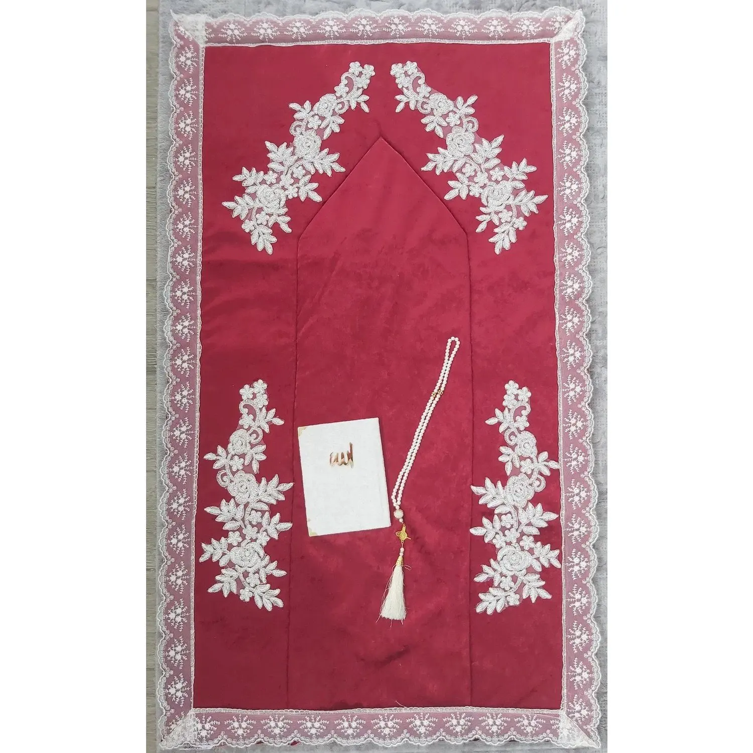 Tapis de prière Ahu en soie de luxe + chapelet en cristal + boîte en acétate de Coran de grande poche ensemble décoré soie de luxe Ah bordeaux couleur rouge et or