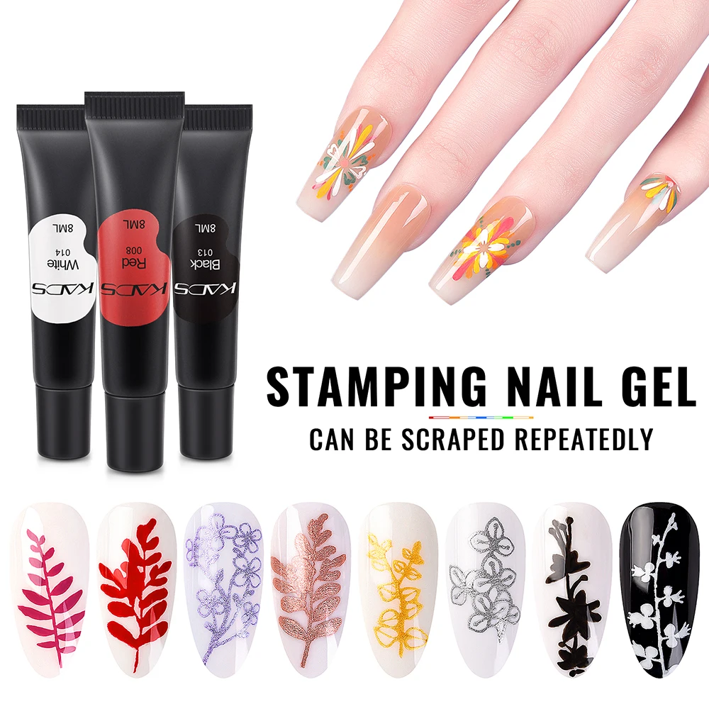 Pour utiliser ce gel d’estampage, commencez par appliquer une couleur de base sur vos ongles, puis appliquez le latex d’ongle de KADS. Ensuite, appliquez le gel d’estampage KADS sur le pochoir de votre choix et grattez l’excès de gel. Appuyez ensuite sur le tampon pour transférer le motif sur vos ongles. Enfin, retirez le latex d’ongle et appliquez une couche de finition.