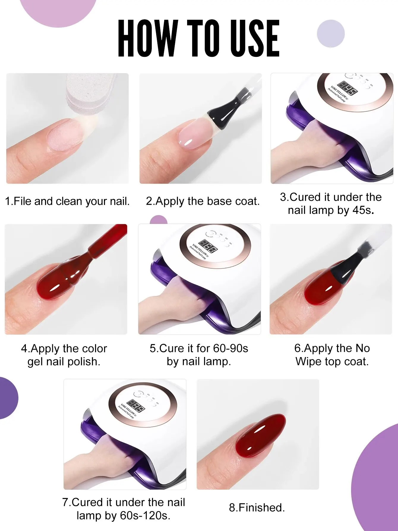 Il faut 60 secondes pour durcir chaque couche de vernis gel avec une lampe LED d’une puissance de 48W ou plus.