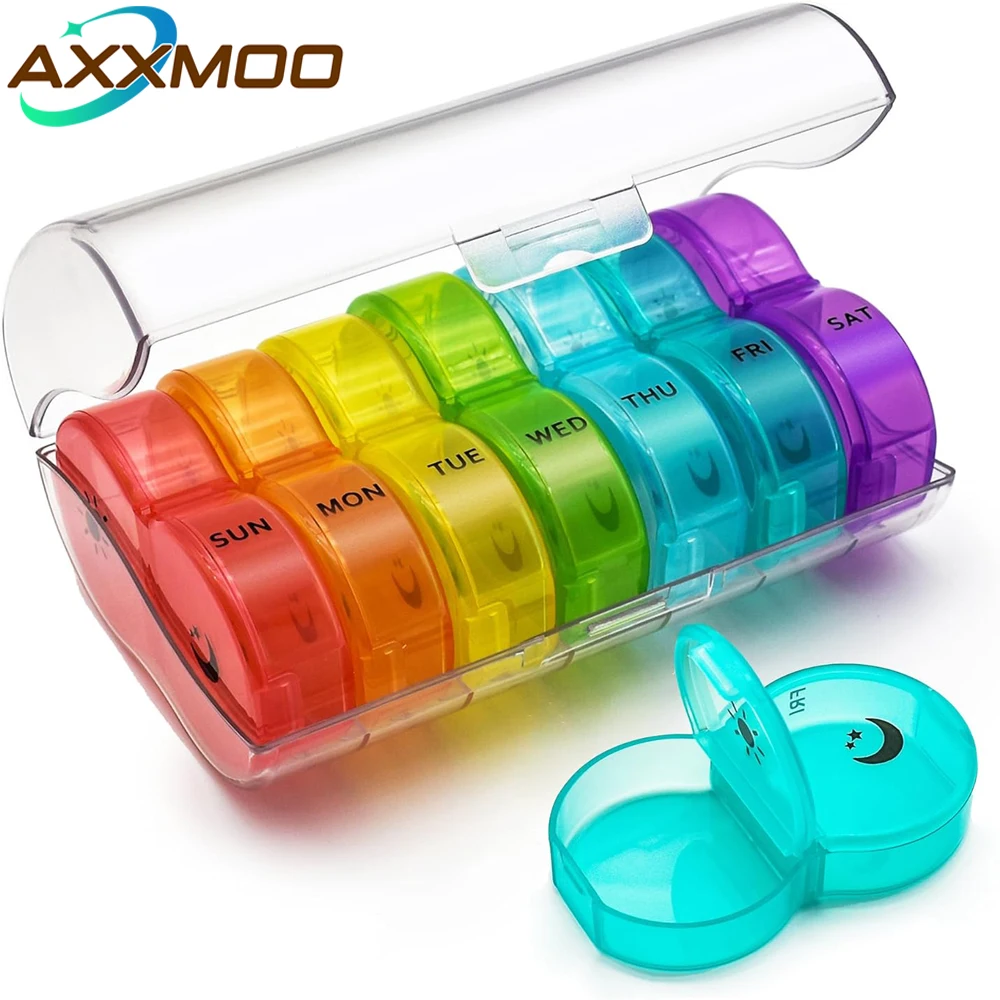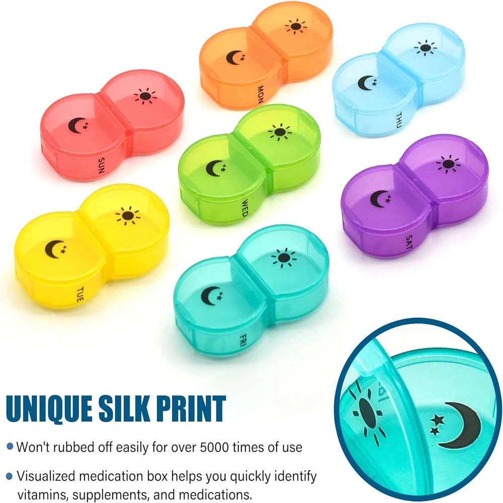 - Distributeur de pilules 7 jours: Le porte-pilules se compose de 7 contenants de pilules compacts de couleurs différentes avec chaque boîte a été imprimée avec la date de la semaine et les étiquettes AM/PM évitent de mélanger, faire la gestion de votre médecine hebdomadaire de prescription de nuit du matin simple.