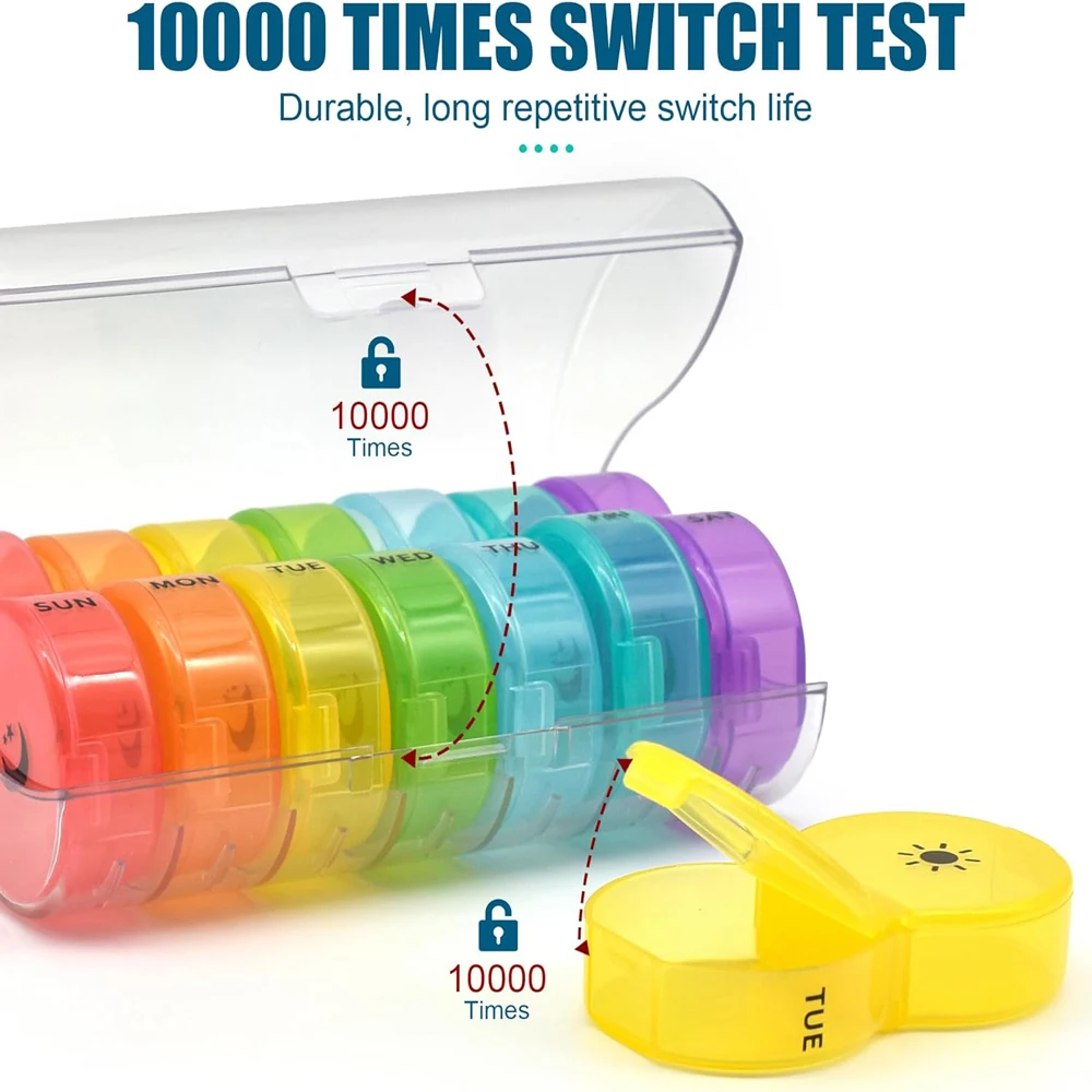 - Safe et durable: Le trieur de pilules quotidien est fabriqué à partir de matériaux de qualité alimentaire sans BPA, non toxique et non nocif, robuste et durable, si l’impression en soie ou les charnières peuvent être réutilisées plus de 10 000 fois.