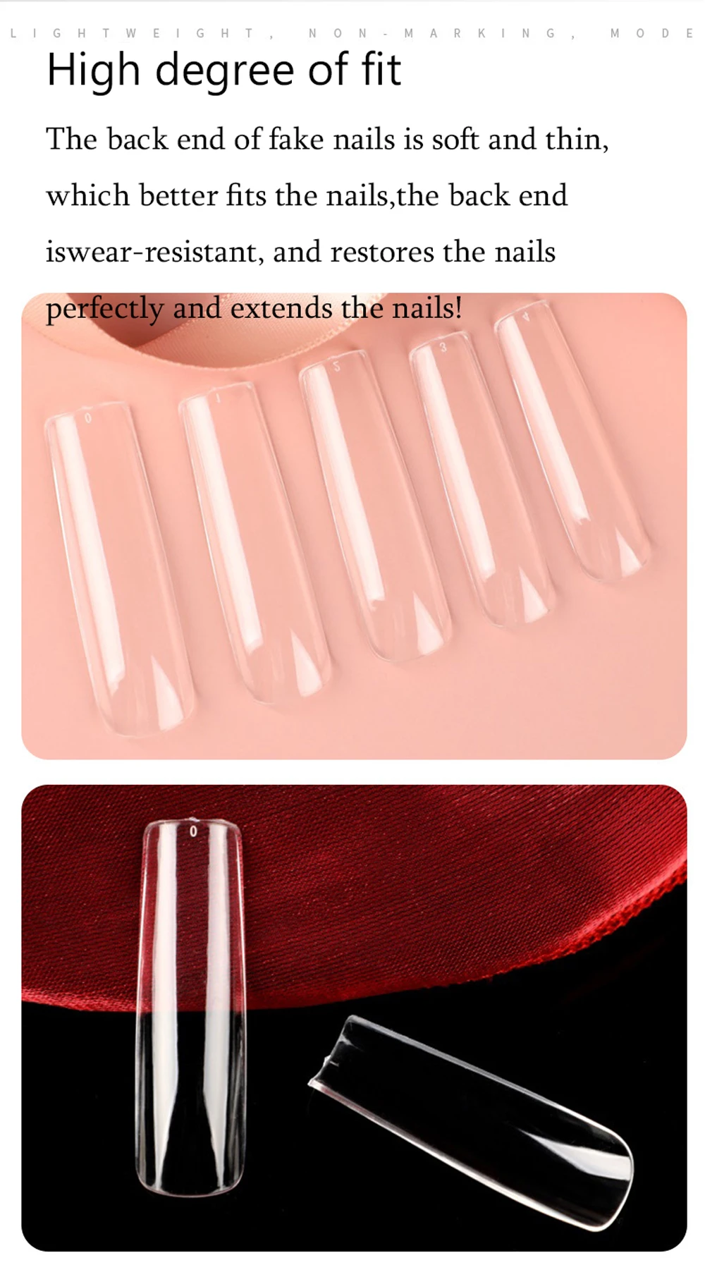 - L’extrémité arrière des faux ongles est souple et fine, ce qui s’adapte mieux aux ongles