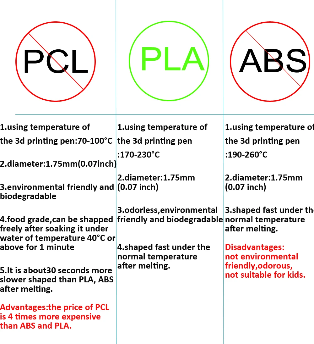 Concernant les types de filament, vous avez le choix entre PLC et PCL. Le filament PLA peut fonctionner à une température de 180°C à 230°C, tandis que le filament PCL peut fonctionner à une température inférieure ou égale à 40°C.