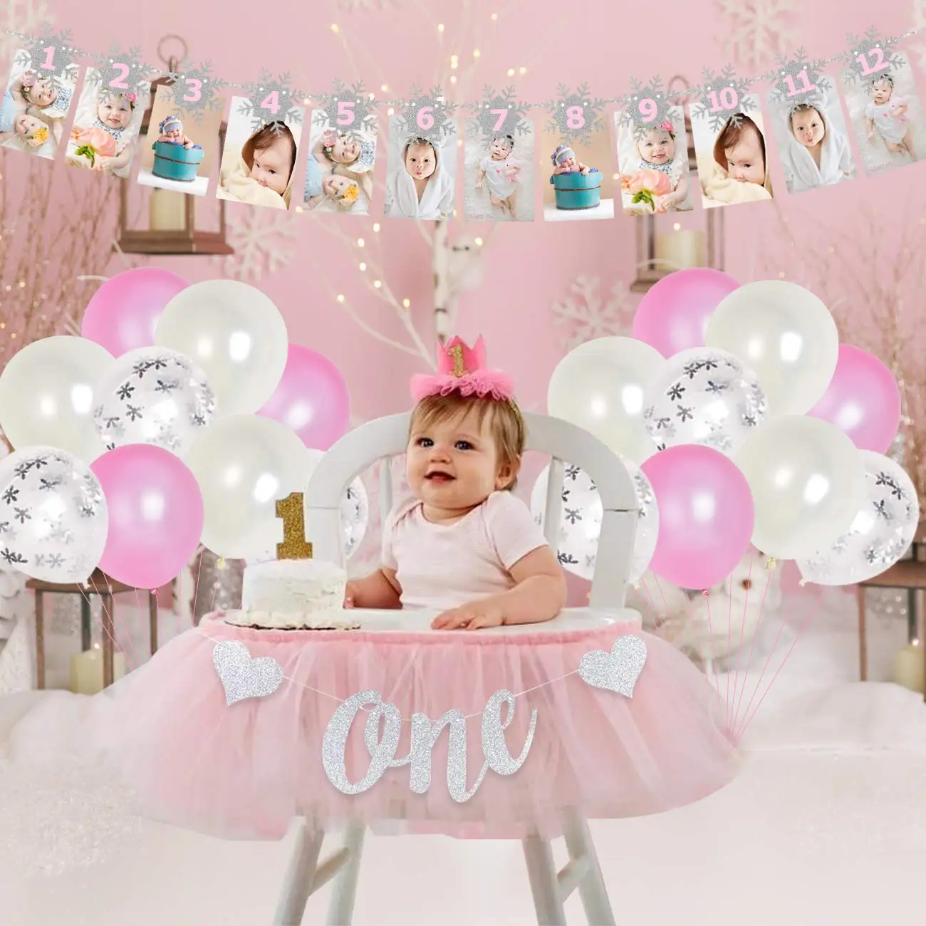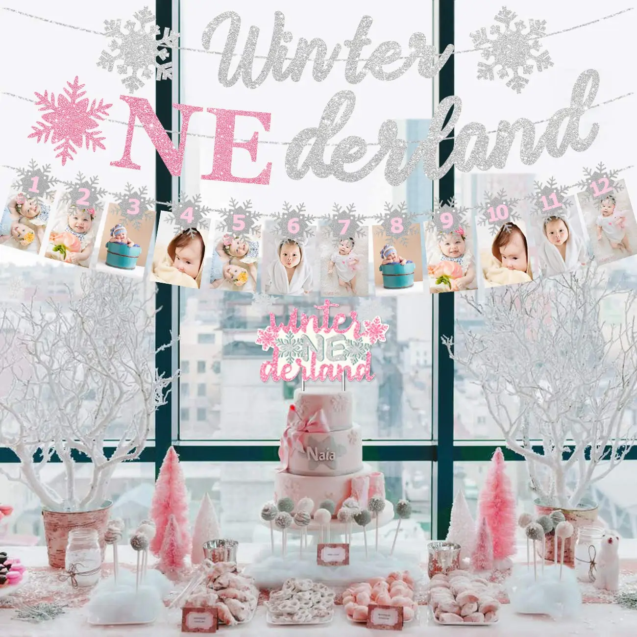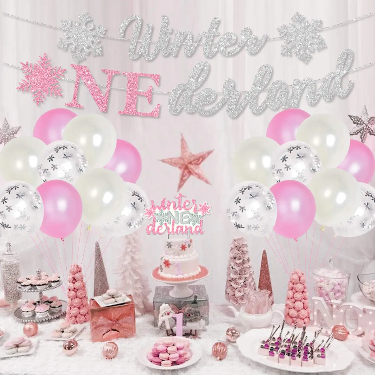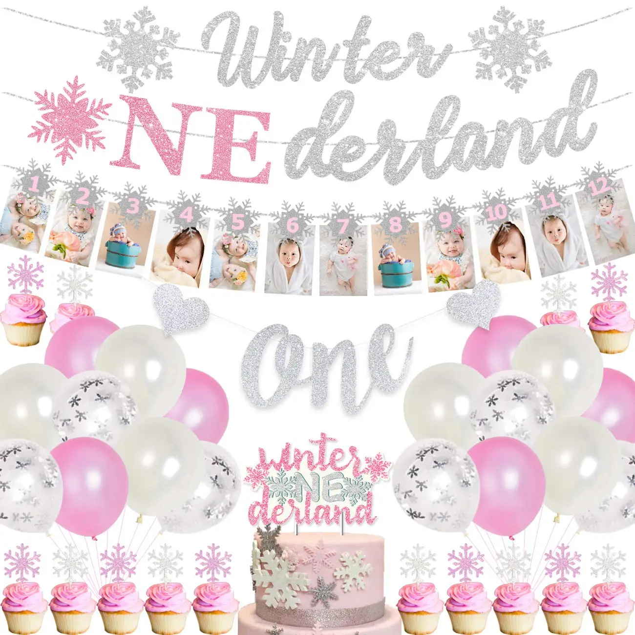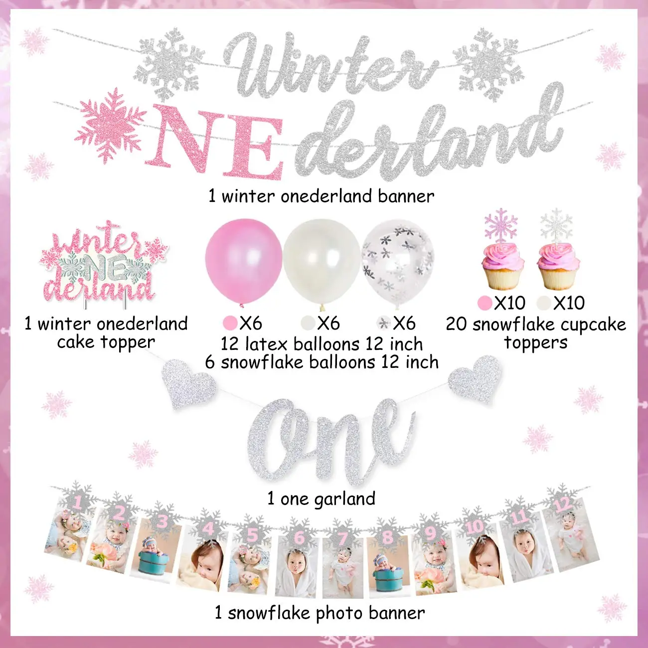 - ❄ Décoration de fête du 1er anniversaire de Winter Wonderland : le paquet comprend 1 bannière onederland d’hiver, 1 topper de gâteau d’hiver onederland, 20 décorations de cupcake flocon de neige (10 argent, 10 roses), 1 bannière photo flocon de neige, 1 guirlande, 12 ballons en latex (6 roses, 6 blancs) 12 pouces, 6 ballons flocon de neige 12 pouces.