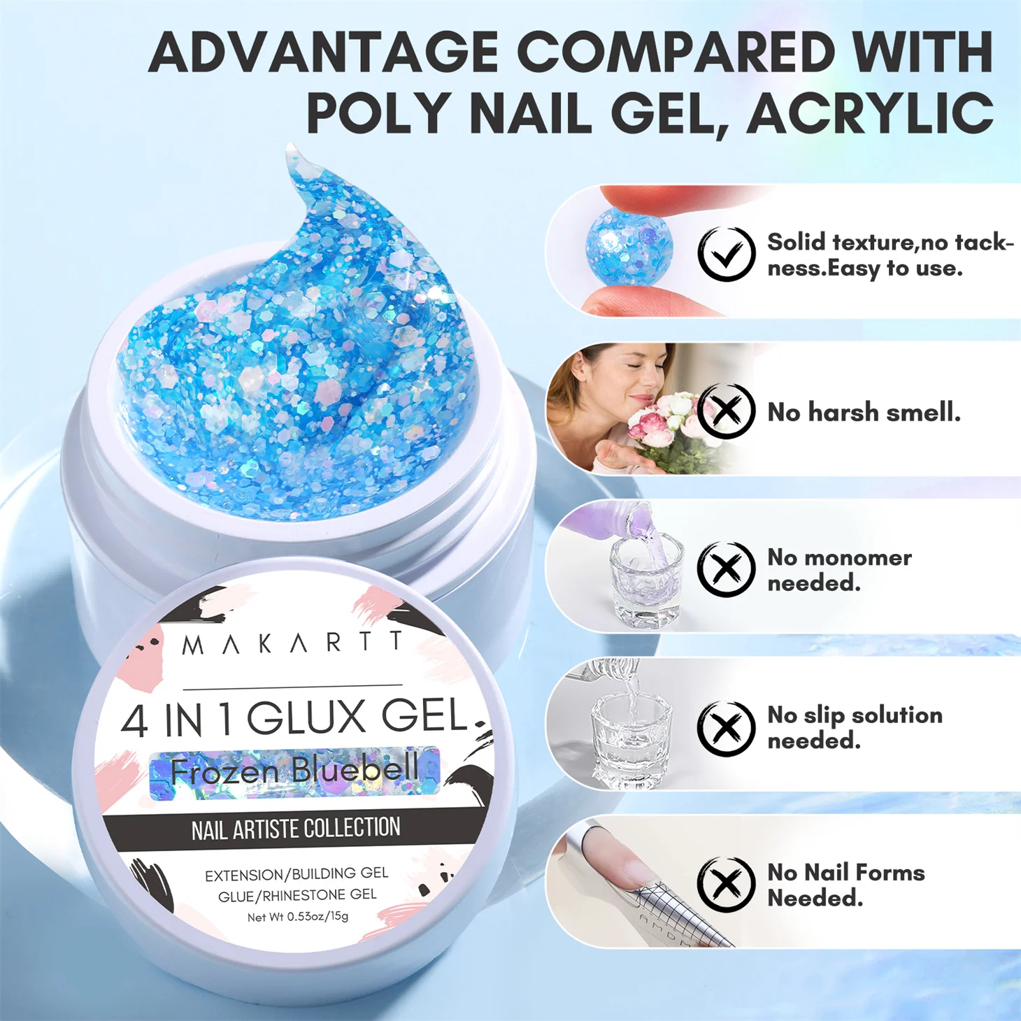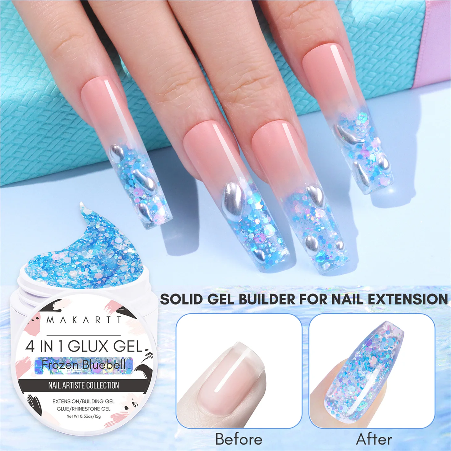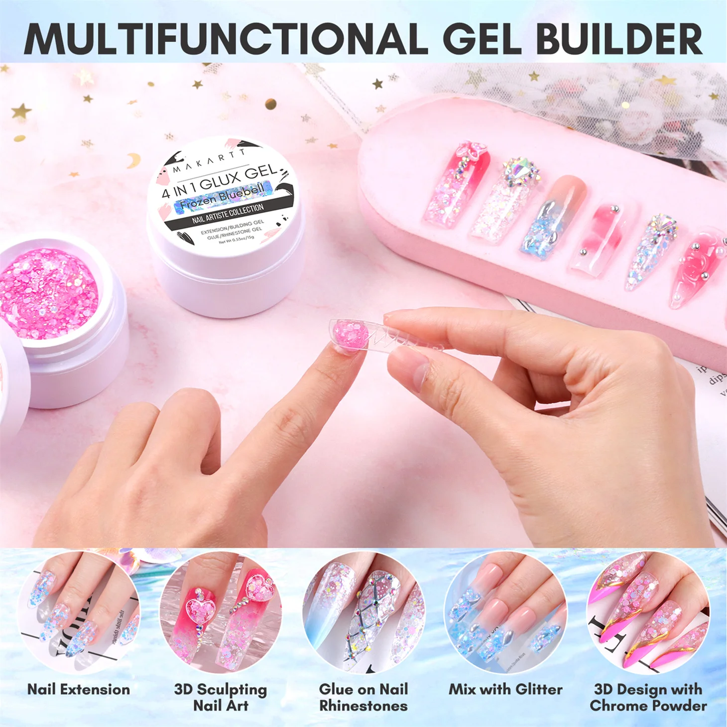 D’après la description du produit, le Makartt-Gel Solide 4 en 1 pour Extension d’Ongles à Paillettes, Sculpture 3D, Nail Art, UV, Colle à Pression