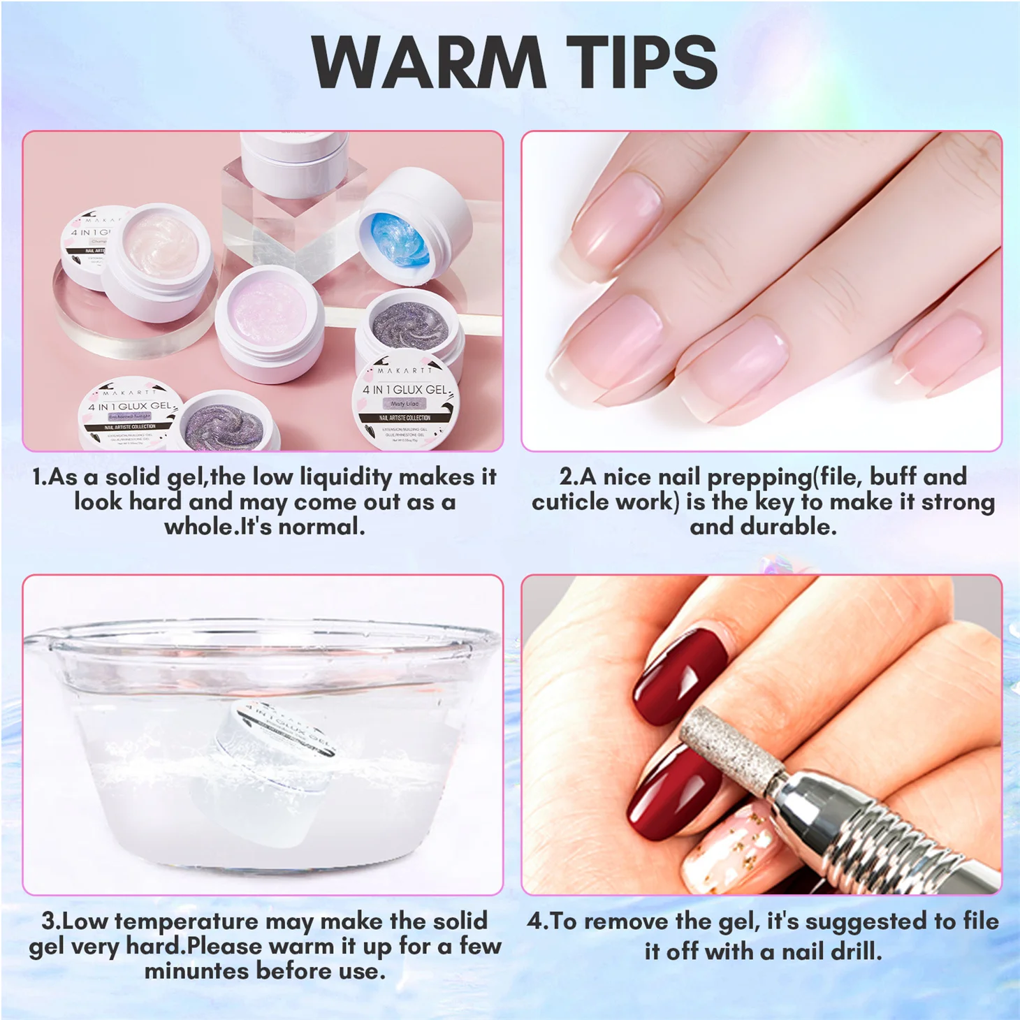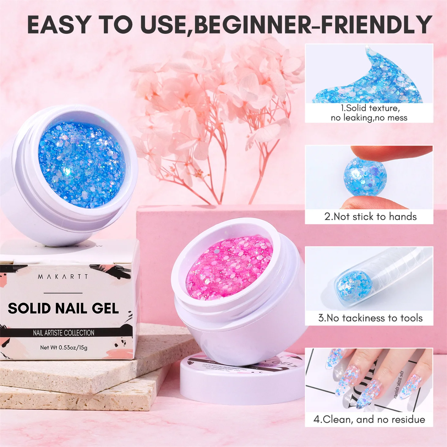 Le Makartt-Gel Solide 4 en 1 pour Extension d’Ongles à Paillettes, Sculpture 3D, Nail Art, UV, Colle à Pression est un gel multifonctionnel qui peut être utilisé pour différentes techniques de nail art. Il s’agit d’un gel solide non coulant, facile à manipuler, ce qui le rend adapté aux débutants.