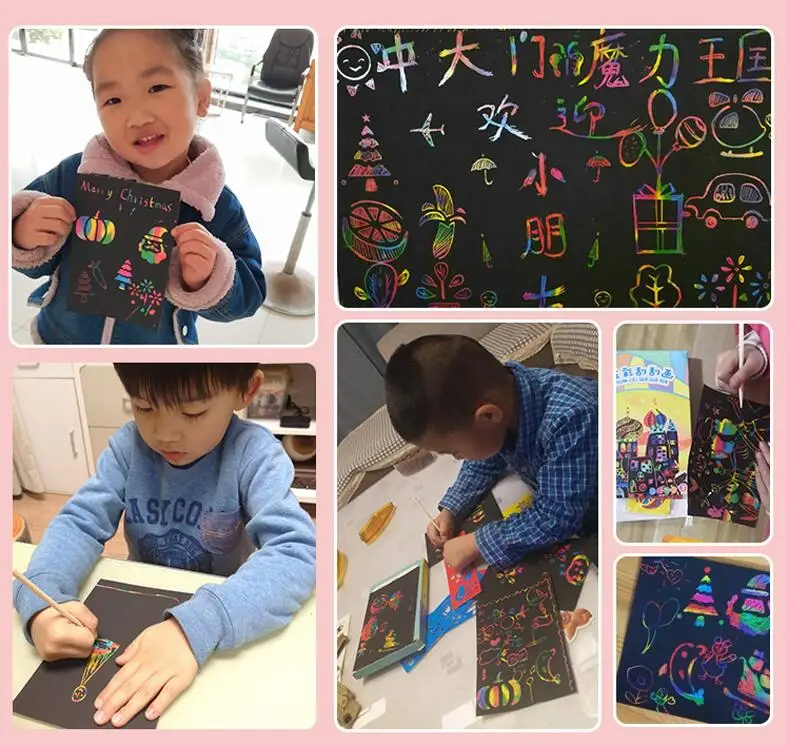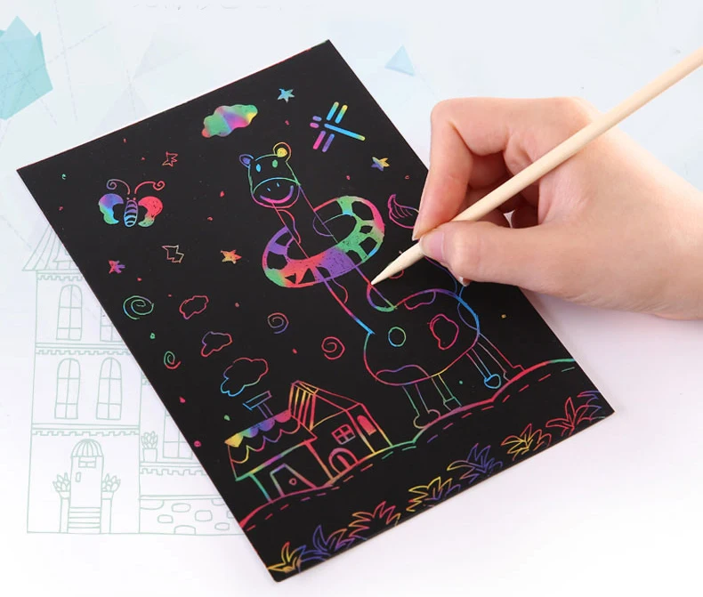 Le jeu de cartes magiques en papier est conçu pour les enfants âgés de 3 ans et plus, ce qui en fait un cadeau idéal pour les jeunes enfants qui aiment s’exprimer artistiquement. Les enfants peuvent laisser libre cours à leur imagination en grattant les cartes pour révéler de magnifiques couleurs arc-en-ciel.
