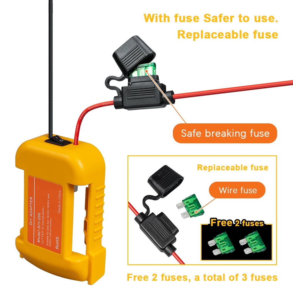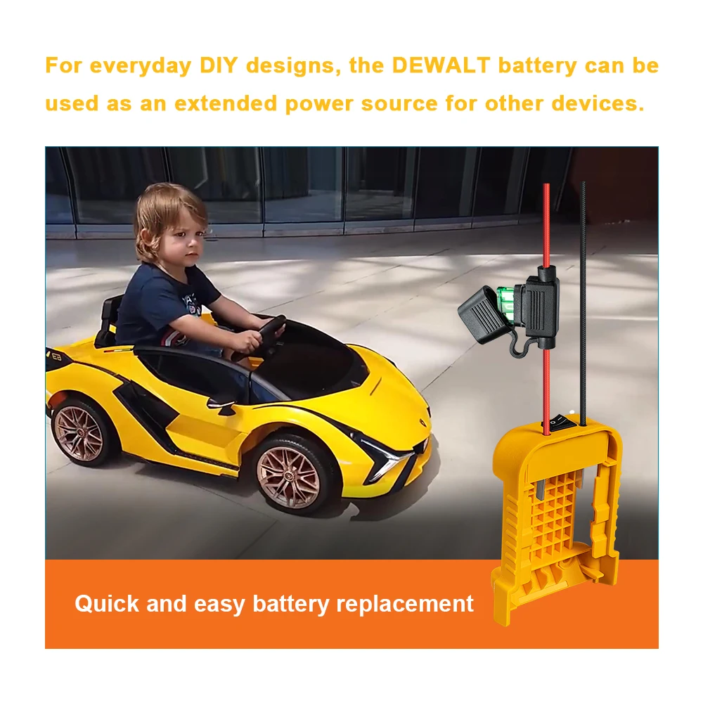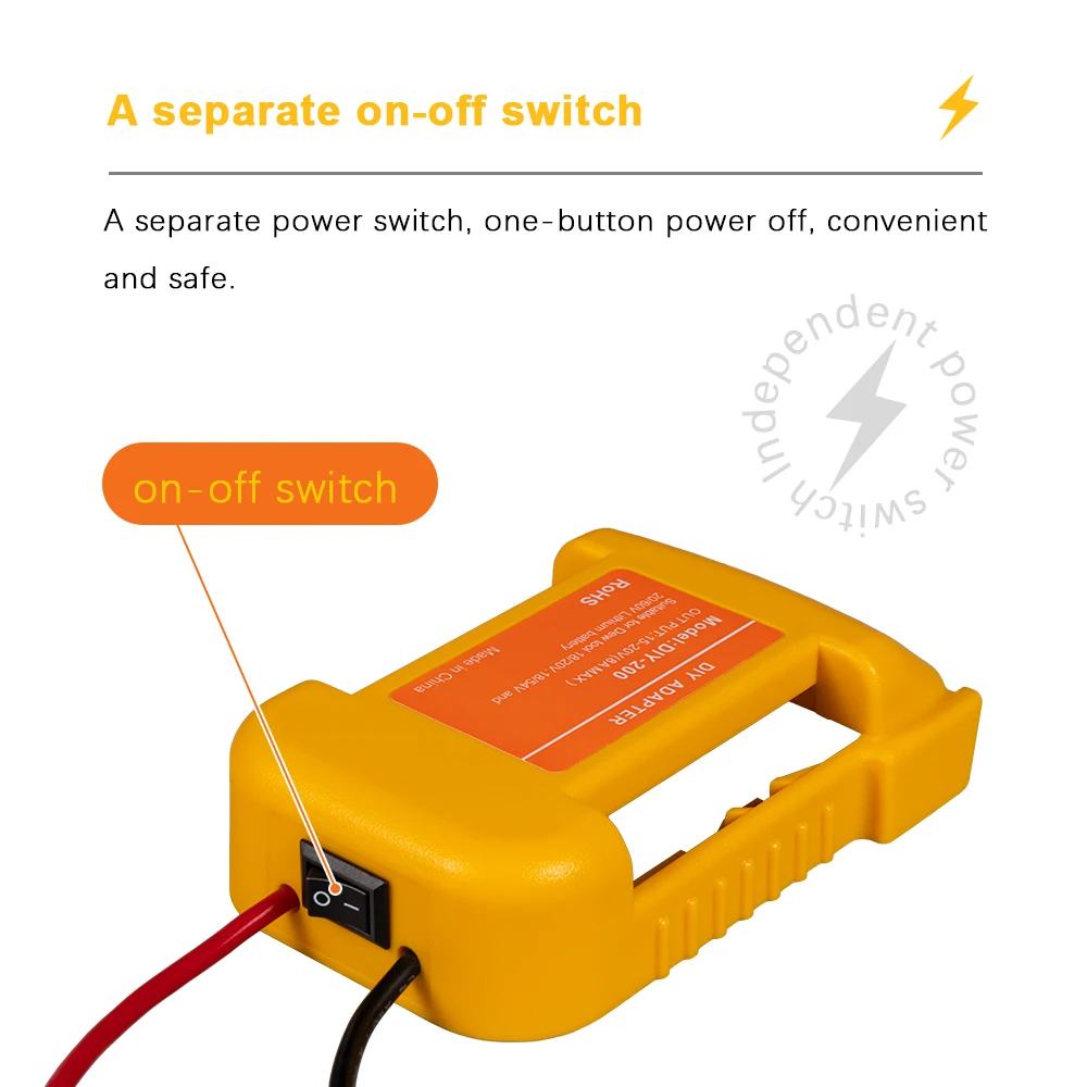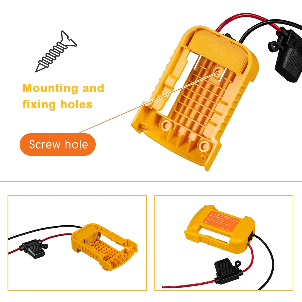 Le produit convient aux batteries d’outils électriques DEWALT. Pour les conceptions de bricolage quotidiennes, la batterie DEWALT peut être utilisée comme source d’alimentation étendue pour d’autres appareils. Ce produit est conçu avec des interrupteurs et des fusibles, ce qui le rend plus sûr à utiliser. La coque est en matériau ABS, ignifuge et résistant aux chutes. Il y a des trous de vis pour la fixation.