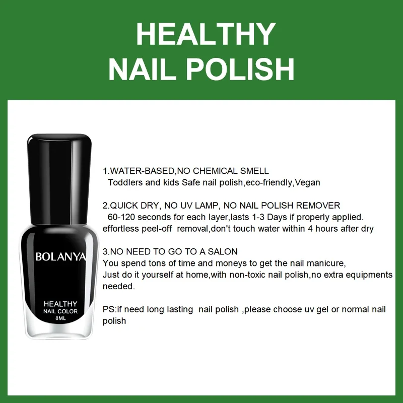 Le vernis à ongles à base d’eau dure environ 1 à 3 jours, pas besoin de dissolvant pour vernis à ongles, se décolle facilement., il est végétalien/sans cruauté/non toxique pour le marché musulman, si vous avez besoin de vernis à ongles longue durée, vous pouvez choisir un vernis ordinaire ou un gel UV.