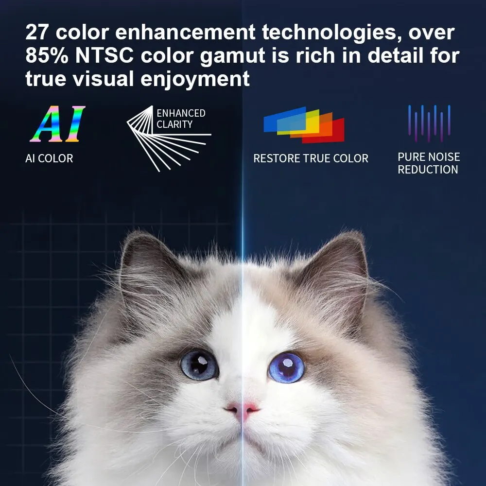 Le projecteur offre un écran de 150 pouces, avec une distance de projection optimale de 1,68 mètre. Sa portabilité le rend également idéal pour une utilisation en extérieur. Sa CPU puissante et sa mémoire de 64 Go permettent à votre appareil de fonctionner plus facilement, avec plus de téléchargements et d’installation d’applications. Il dispose également de 27 technologies d’amélioration de la couleur, offrant une gamme de couleurs riche en détails pour une expérience visuelle agréable. L’entrée HDMI permet à tous vos appareils HD de participer au plaisir de la projection. Enfin, le réglage électrique de la distance de focalisation facilite la mise au point du projecteur.