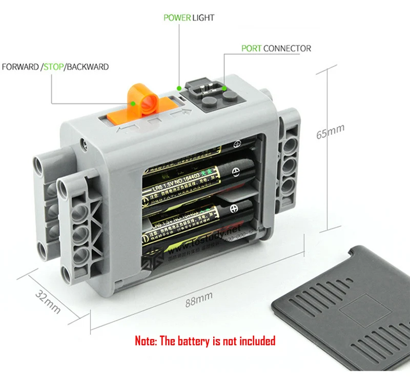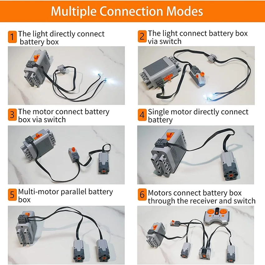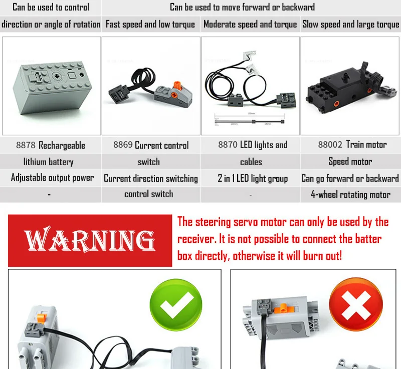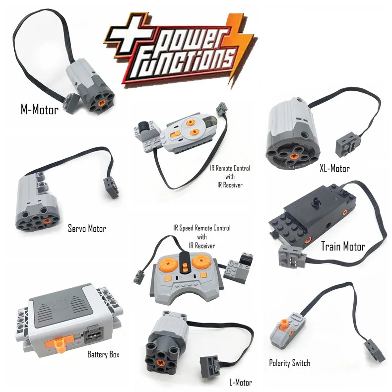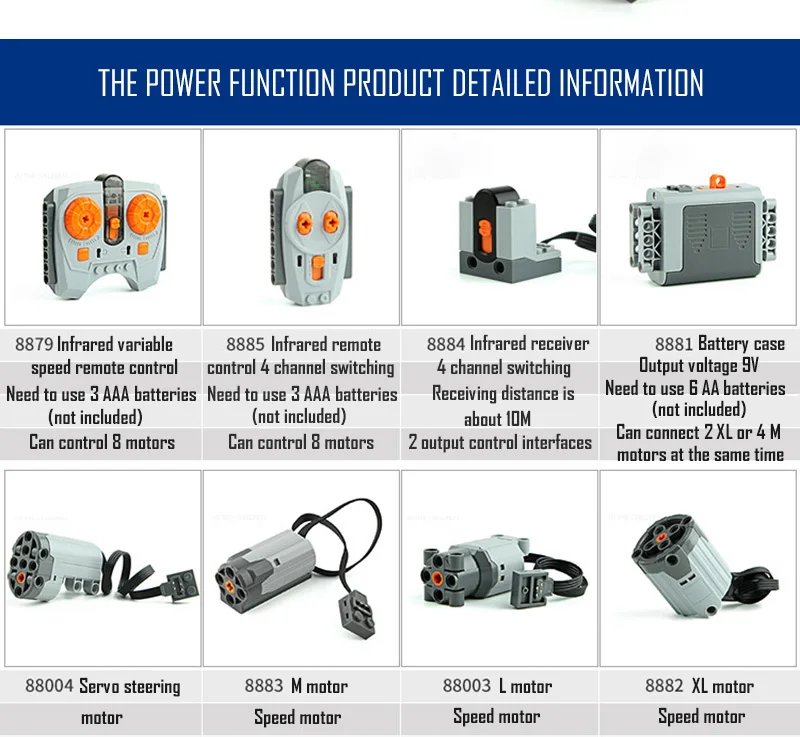 | Numéro de modèle | M-moteur 8883, boîtier de batterie 8881, XL-moteur 8882, servomoteur 88004, L-Moteur 88003, Lumière 8870, Commutateur 8869, IR TX 8885, Télécommande de vitesse IR Contrôle 8879, moteur de train 88002, boîtier de batterie AAA 88000 |