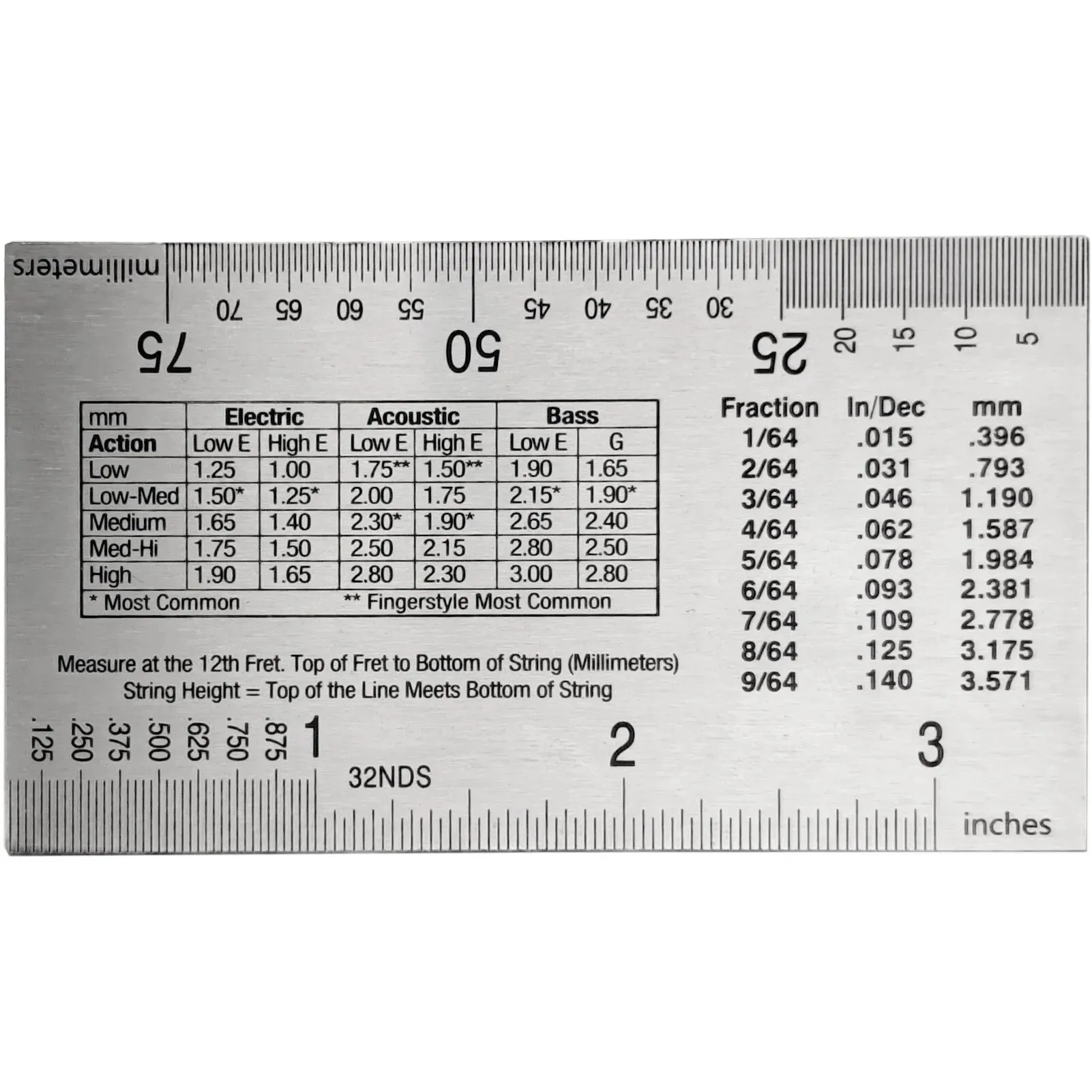 • Un côté de cette règle d’action de cordes de guitare est imprimé avec un tableau de conversion pour l’action de la 12e frette et la conversion de taille, fournissant une référence standard pour l’utilisation de la jauge de hauteur de corde.