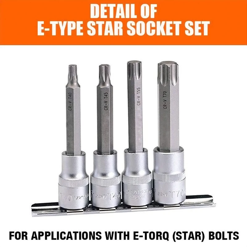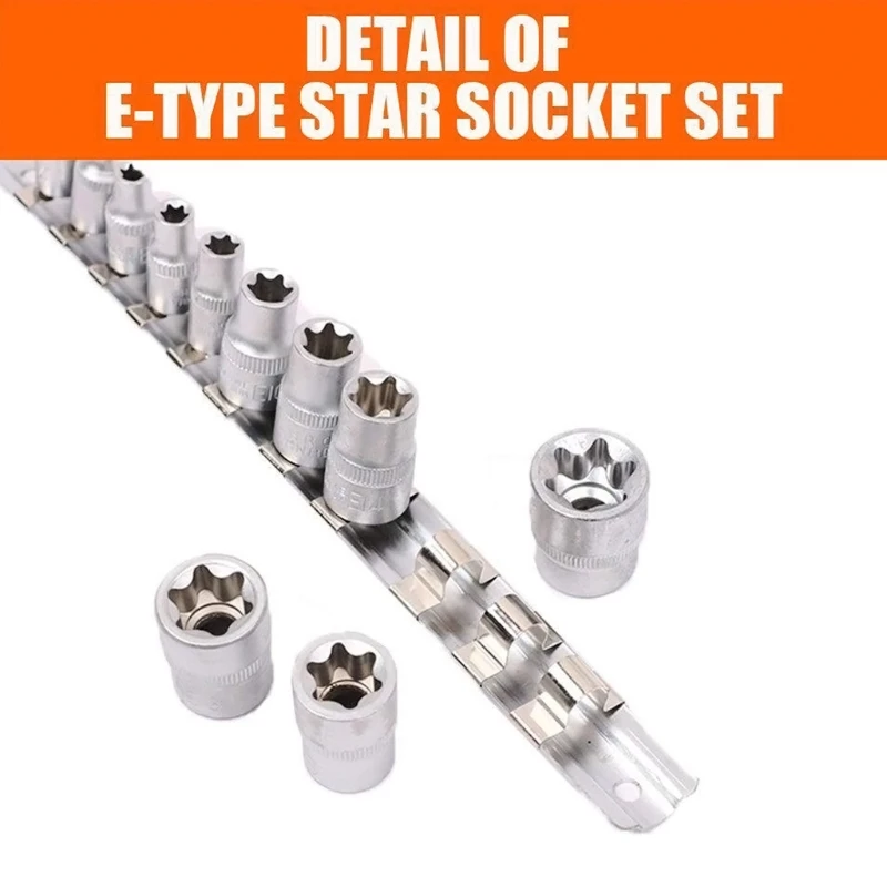 Le jeu de douilles étoile E-TORX femelle avec rail est composé de 11 pièces, dont 5 douilles d’entraînement 1/4″ de taille E4, E5, E6, E7, E8 et 6 douilles d’entraînement 3/8″ de taille E10, E12, E14, E16, E18, E20. Ces douilles en acier allié sont un must pour la plupart des nouveaux véhicules.