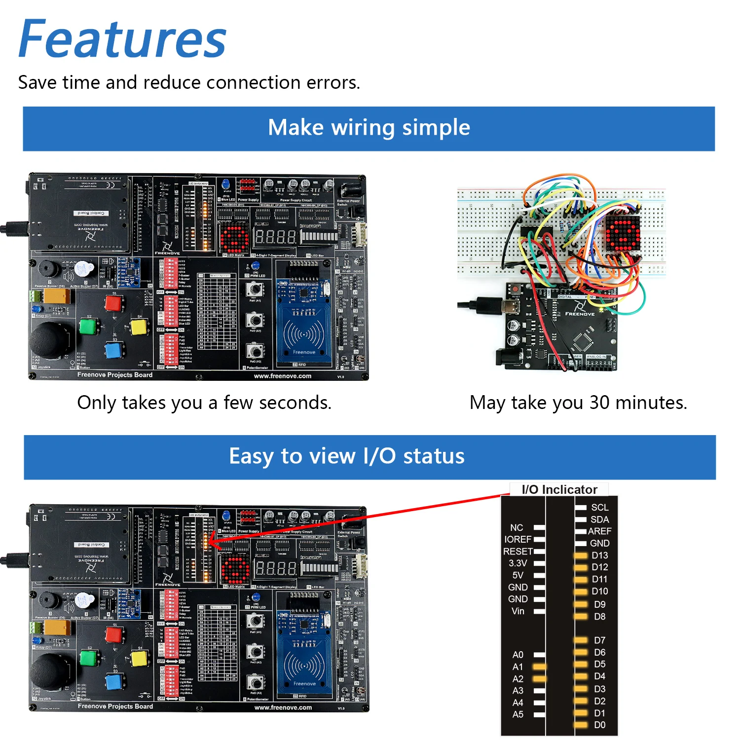 Ce kit de projets FreenGru est un choix idéal, que vous soyez débutant ou expérimenté. Il comprend un tutoriel détaillé de 238 pages avec des projets de base et avancés. Le câblage simple permet de changer rapidement de circuits sans complication. Vous trouverez également 46 projets intéressants avec des schémas de circuit et du code vérifié. De plus, il existe des projets avancés supplémentaires pour créer des instruments virtuels et des consoles de jeux. En cas de besoin, une équipe de support technique est disponible pour répondre à vos questions. Ce kit est compatible avec différentes cartes de contrôle, notamment la carte de contrôle Freenove et Arduino UNO.