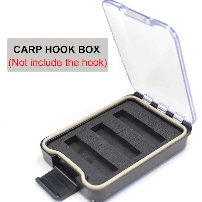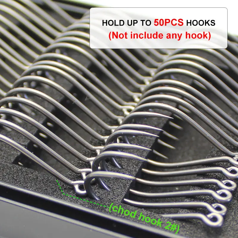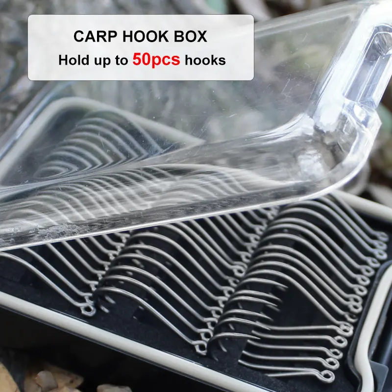 La boîte peut contenir jusqu’à 50 crochets de carpe individuels dans les tailles de 2 à 8.