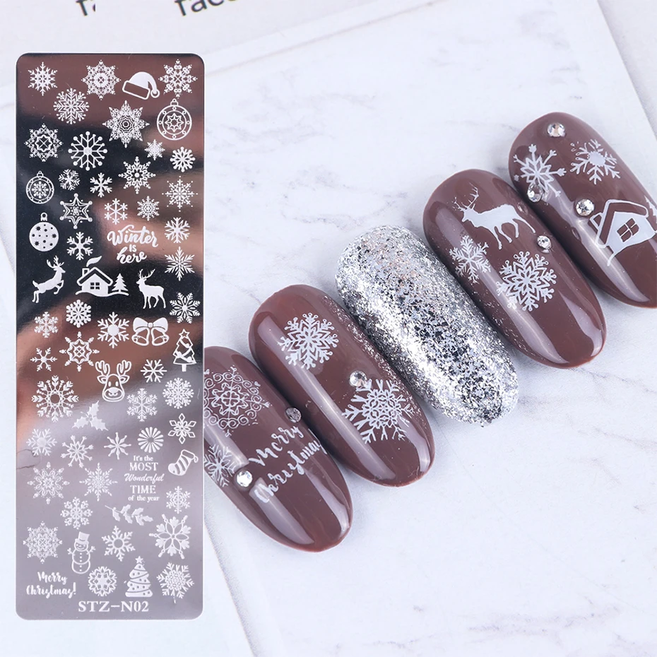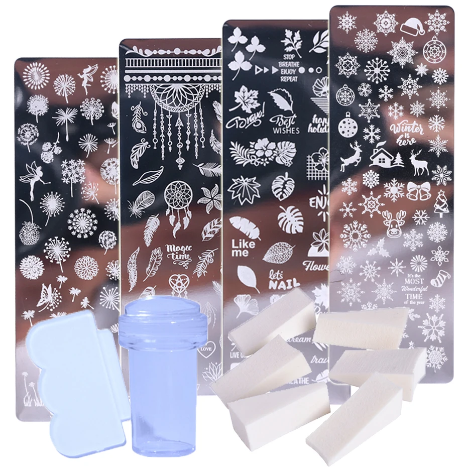 • Ensemble de timbres d’art d’ongle comprenant des plaques, un vernis à ongles imprimé, une feuille, une fleur, un attrapeur de rêves, un flocon de neige et des motifs de Noël.