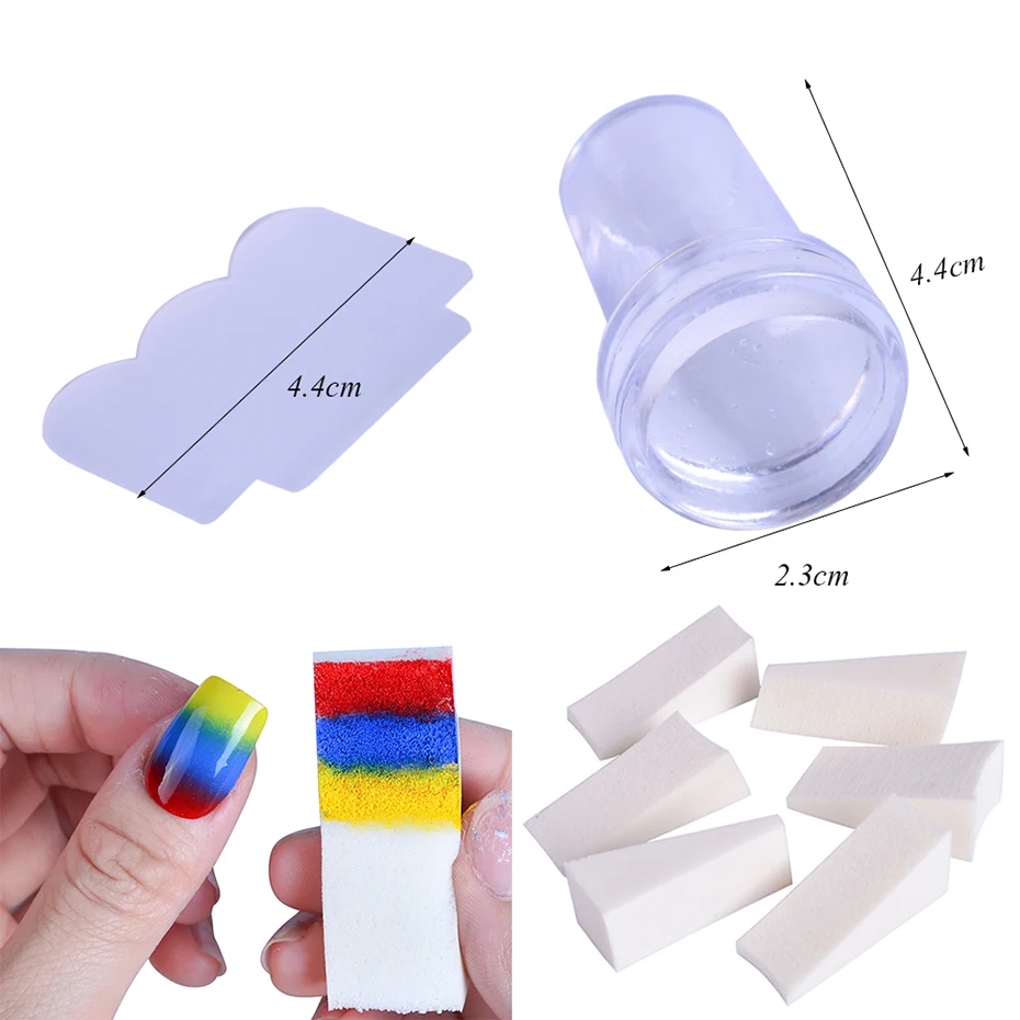 Cet ensemble comprend 1 tampon d’art d’ongle, 1 tampon en silicone, 1 grattoir et 8 éponges.