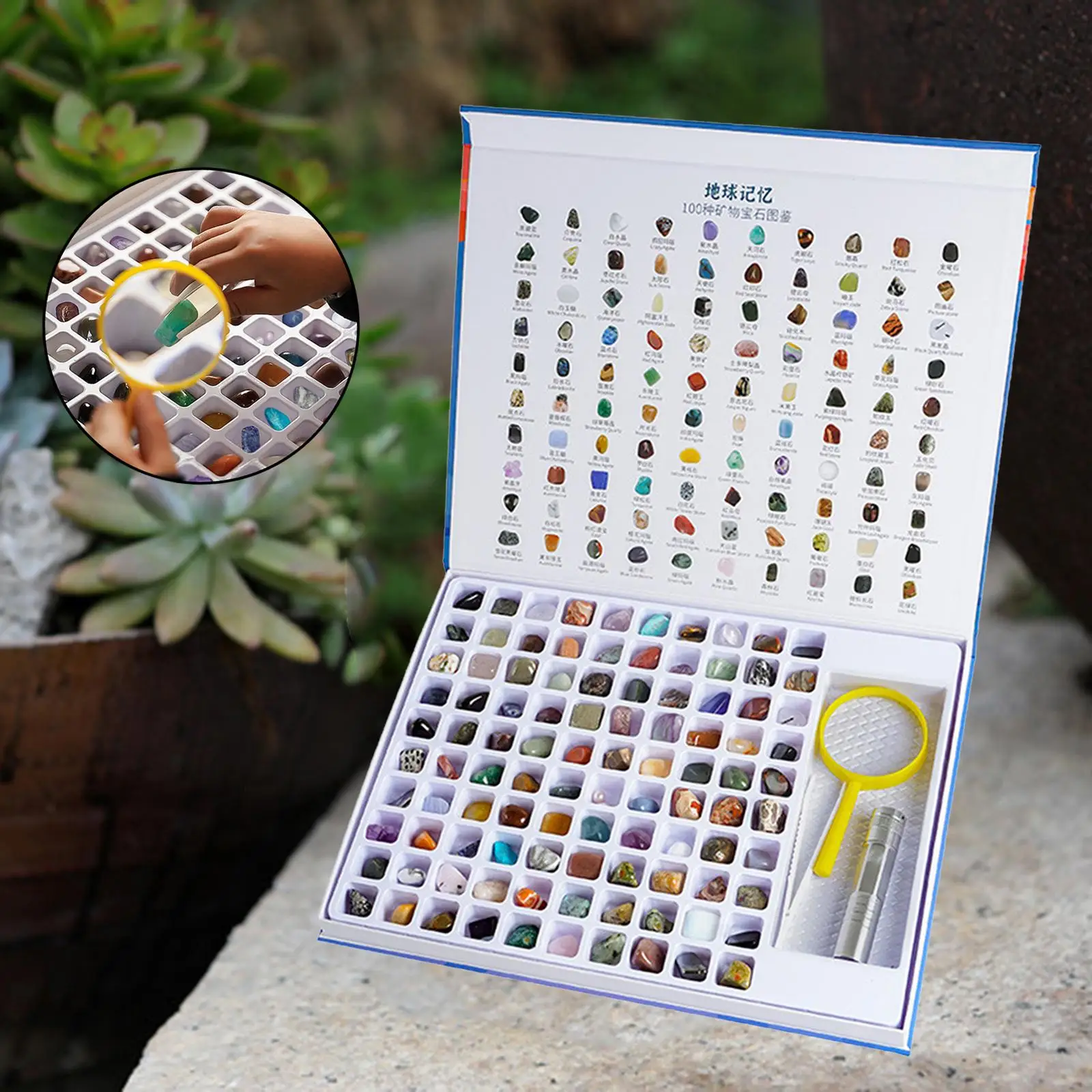 - Comprend: 1 lampe de poche, 1 pince à épiler, 1 loupe, 1 manuel, 100 pierres naturelles
