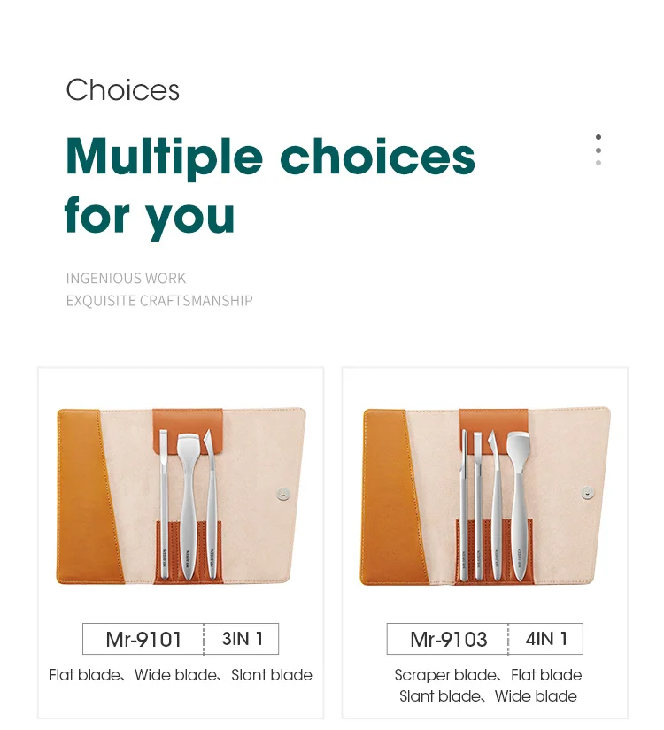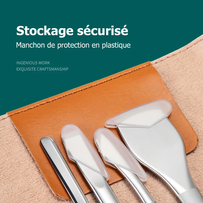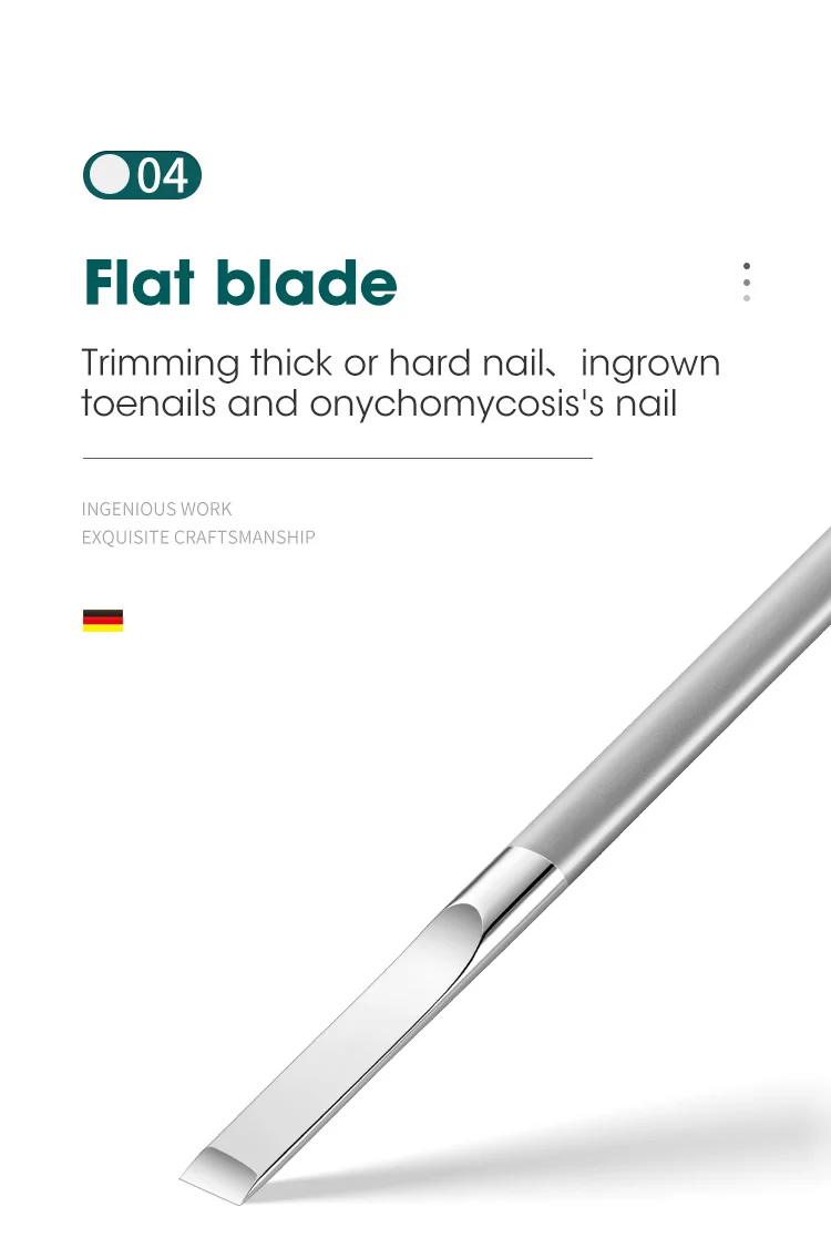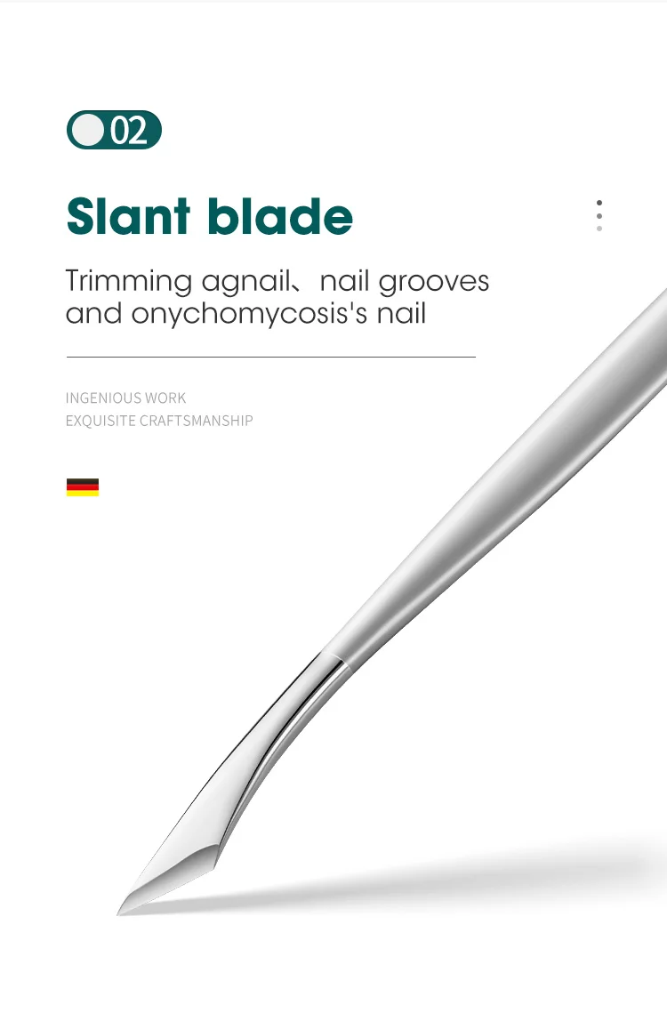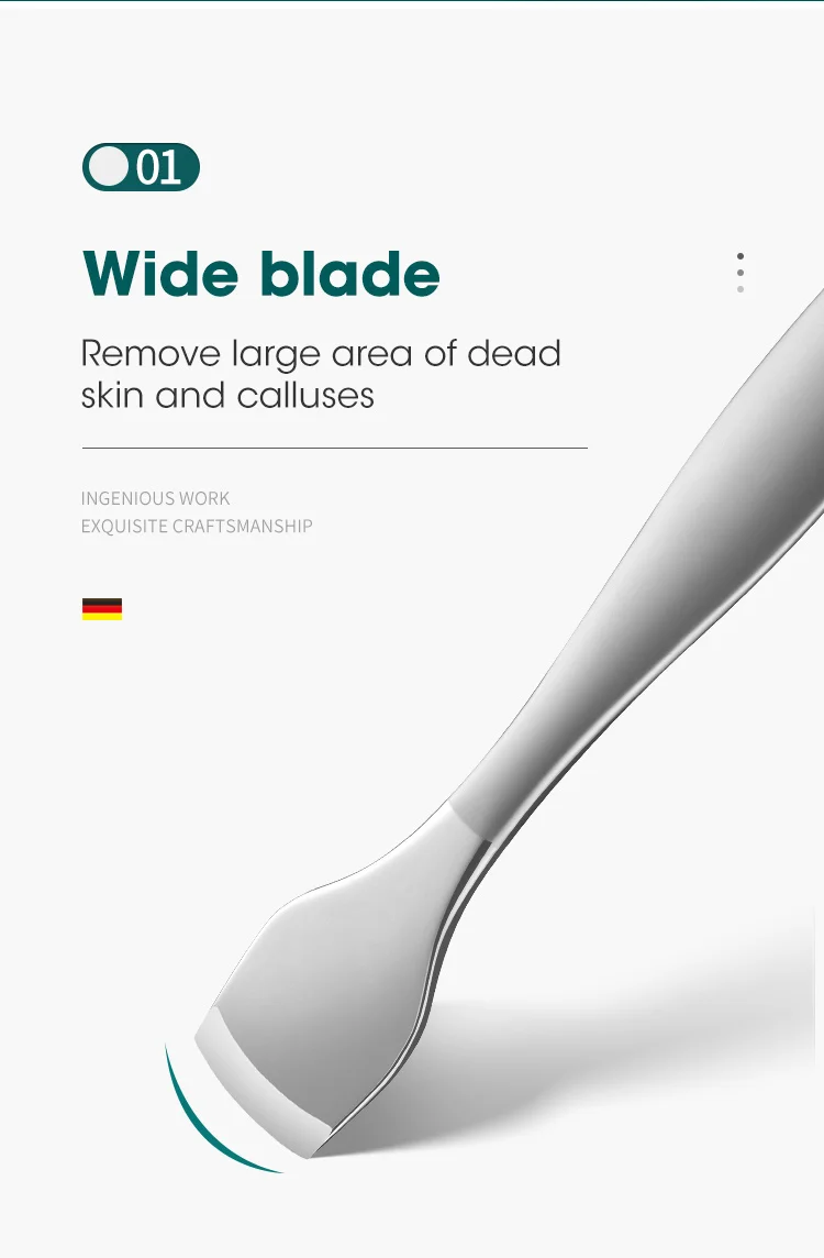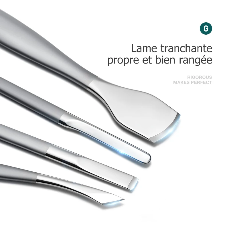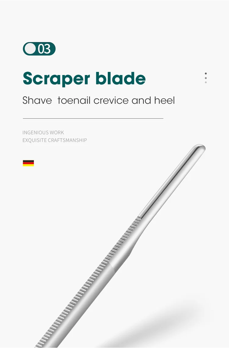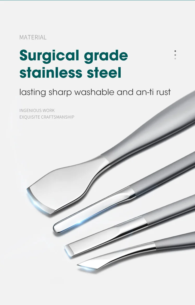 Les couteaux de pédicure sont fabriqués en acier inoxydable de qualité médicale. La technologie de vernis mat et de galvanisation de surface leur confère une apparence texturée et une sensation agréable.