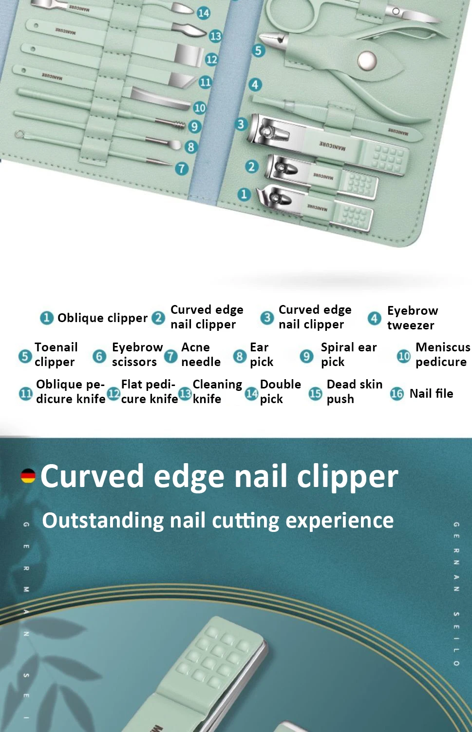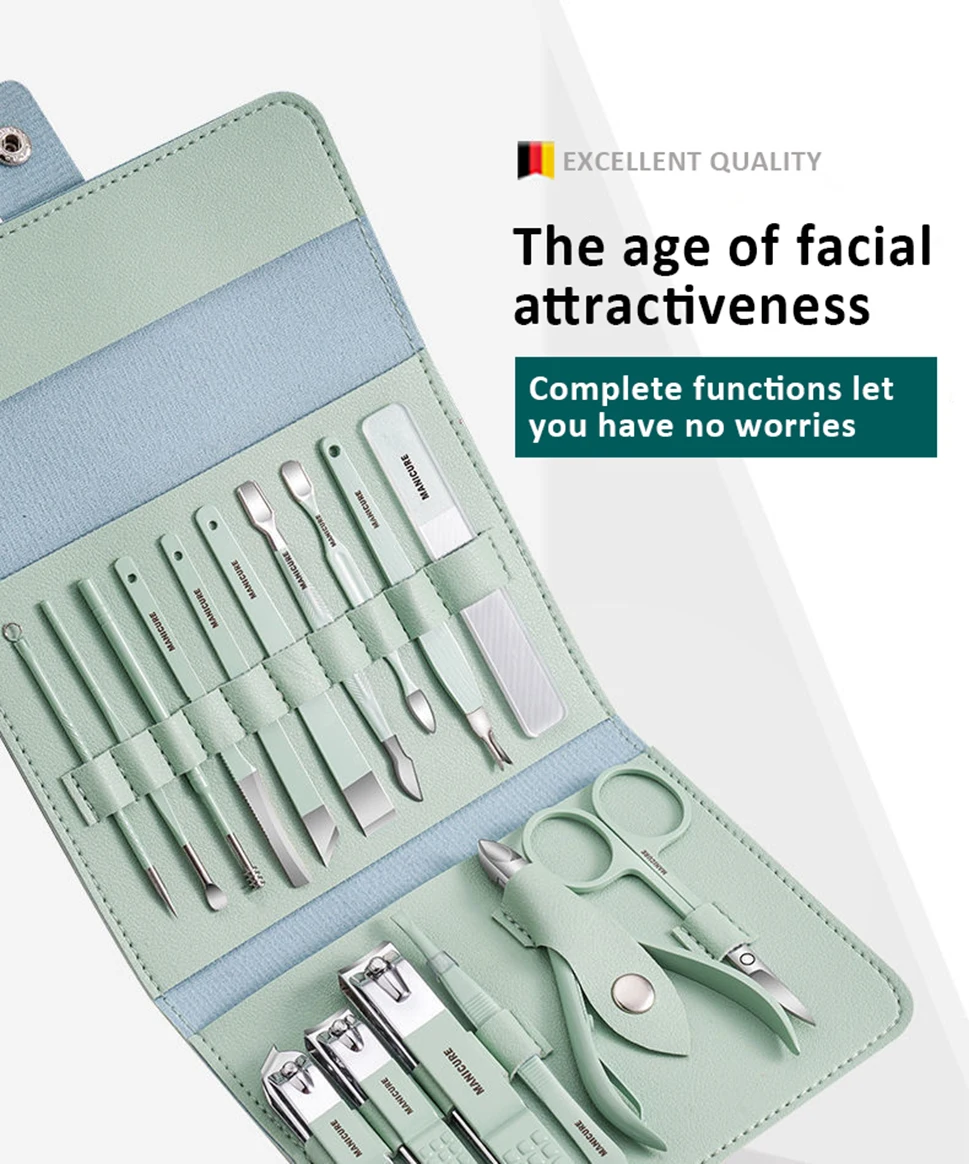 Le kit de manucure et pédicure professionnel 16 en 1 est un produit de haute qualité, durable et fabriqué en acier inoxydable. Il est conçu pour vous aider à couper et à lisser les bords ou les surfaces de vos ongles, ainsi qu’à résoudre les problèmes faciaux et à couper les sourcils. Ce kit comprend différents outils pour répondre à vos besoins en matière de soins des mains, de soins du visage et de soins des pieds. Les matériaux utilisés, tels que l’acier au carbone durable ou l’acier inoxydable, permettent un nettoyage facile et sont résistants à la rouille. L’étui en cuir élégant facilite l’organisation et le transport de ce kit, qui convient aussi bien aux salons professionnels qu’à un usage domestique.
