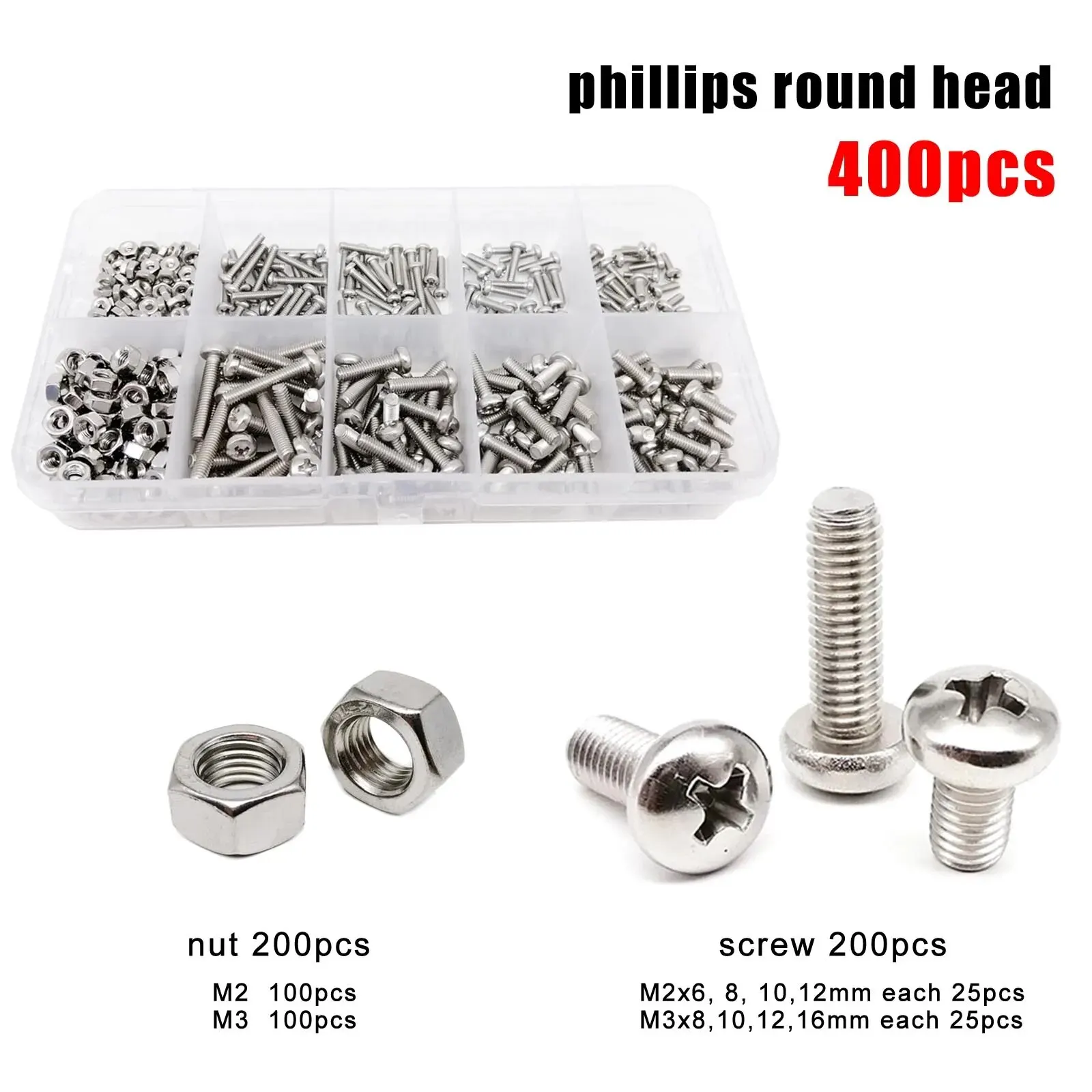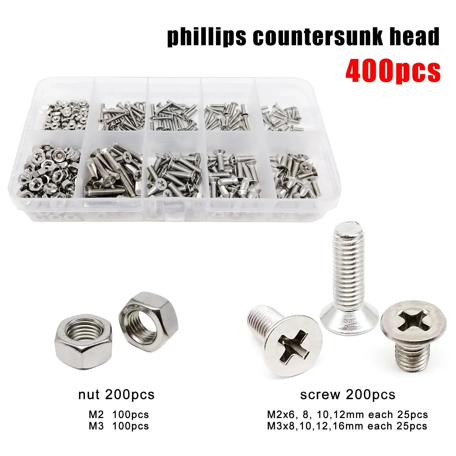 8 tailles vis: M2 * 6mm 25 pièces, M2 * 8mm 25 pièces, M2 * 10mm 25 pièces, M2 * 12mm 25 pièces, M3 * 8mm 25 pièces, M3 * 10mm 25 pièces, M3 * 12mm 25 pièces, M3 * 16mm 25 pièces