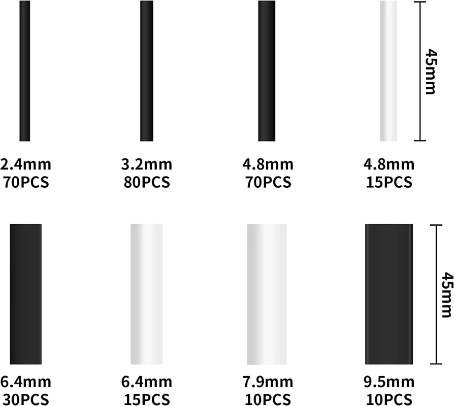 - Il y a des tubes thermorétractables blancs de 7.9mm(10 pièces)/6.4mm(15 pièces)/4.8mm(15 pièces) et 2.4mm(70 pièces)/3.2mm(80 pièces)/4.8mm(70 pièces)/6.4mm(30 pièces)/9.5mm(10 pièces) tubes thermorétractables noirs dans un étui pratique, les multiples tailles de ce kit thermorétractable répondent à vos différents besoins.