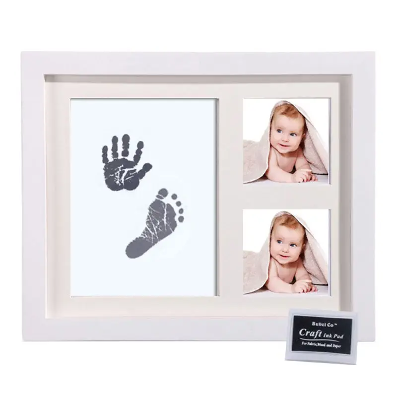 Le cadre photo pour bébés a 2 feuilles de papier babyprints, le tampon encreur propre pour toucher facile à colorier et à créer des empreintes de mains ou de pas claires, sans décoloration, peut être une conservation à long terme.