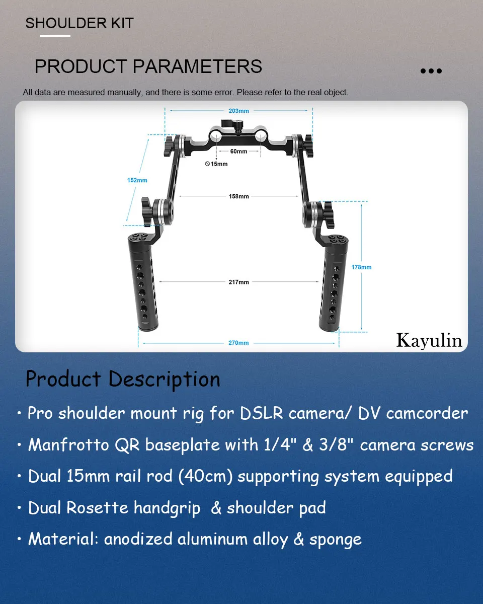 This KayFrederCamera-Kit launched with Manfrotto, QR baseplate, rosette, extension arm, cheese handle for digital SLR camera, camcorder stabilizer is a great accessory for photographers and videographers. It provides stability and versatility, allowing