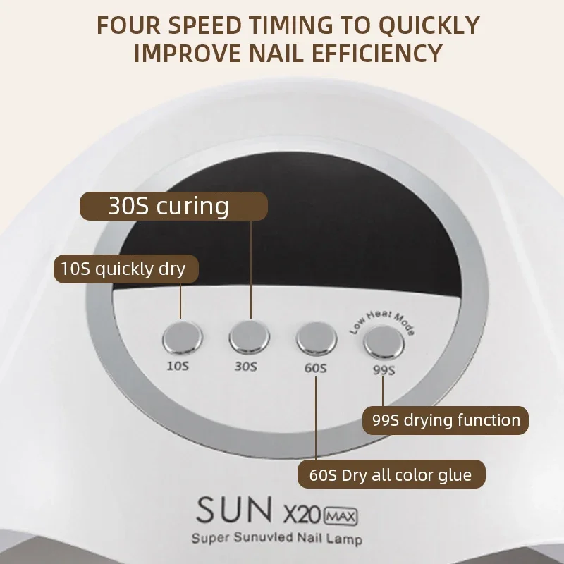 La lampe à LED UV SUN X20 est un outil professionnel de séchage de vernis gel pour les ongles. Elle dispose d’un grand écran LCD qui affiche le temps d’utilisation avec 4 réglages de minuterie différents : 10s, 30s, 60s et 99s en mode basse température. Cette lampe est équipée d’un capteur automatique qui s’allume automatiquement lorsque vous placez votre main sous la lampe.