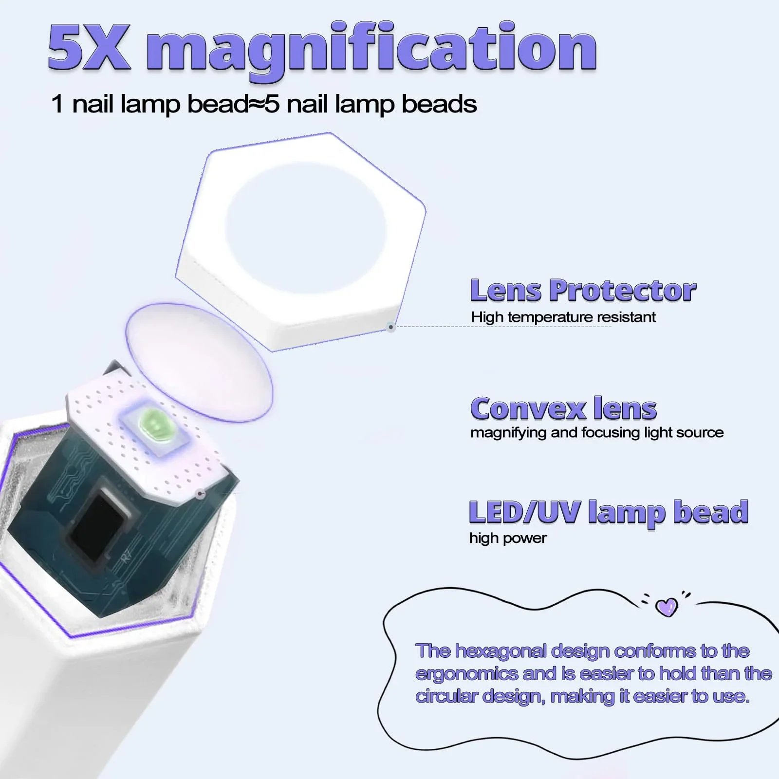 La mini lampe à ongles portable est un outil spécial et innovant avec un design unique qui offre un éclairage à 360 °. Elle utilise des perles de haute qualité de 365 + 405 nanomètres avec des miroirs convexes pour un grossissement jusqu’à 5x du projecteur, facilitant ainsi le collage des diamants et des pointes d’ongles. Idéale pour la décoration d’ongles complexes, elle raccourcit également le temps de durcissement en permettant un durcissement complet de chaque côté et bord des ongles. Elle résout efficacement le problème du gel des ongles difficile. Son design de poche la rend pratique et facile à transporter. Elle dispose de deux modes de réglage de minuterie (20 secondes/60 secondes) et sa puissance maximale est de 3 watts. Elle est rechargeable et dispose d’une batterie intégrée de 250 mAh. Lorsqu’elle est complètement chargée, elle peut fonctionner en continu pendant 40 minutes. En outre, elle est un cadeau parfait pour les amateurs de nail art.