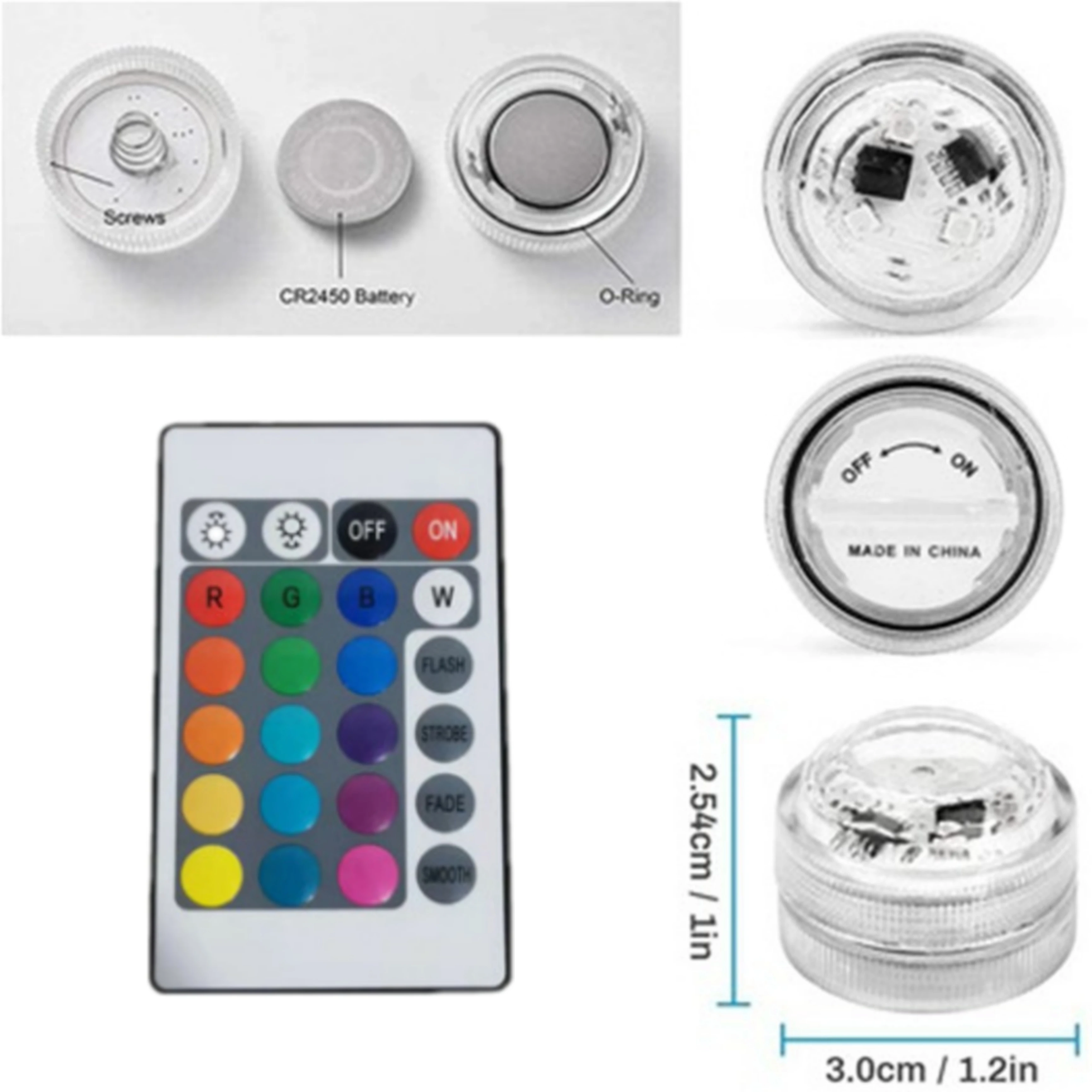 La Lampe LED submersible avec télécommande est un luminaire décoratif d’extérieur idéal pour une piscine ou une fête de mariage. Sa coque en ABS transparente offre une haute transmission de la lumière, résistant à l’usure et anti-chute. Avec des perles de lampe LED SMD3528 haute luminosité, cette lampe offre une longue durée de vie et une bonne luminosité. Elle propose une lumière LED couleur RVB 3 en 1 avec 10 couleurs différentes et change également de couleur. Elle est alimentée par 2 piles CR2032 et peut fonctionner pendant environ 16 heures. Grâce à sa télécommande, vous pouvez allumer et éteindre les lumières LED, changer les couleurs, la vitesse et la luminosité. La lampe est étanche à 100% et peut être utilisée dans l’eau sans problème. Elle convient pour les mariages, les festivals, les aquariums, les piscines, les fontaines, les scènes, les bars disco, les jouets, les vases, les centres commerciaux, les bijouteries, les salles d’exposition, les vitrines, les armoires, les musées, les magasins et les ampoules domestiques.