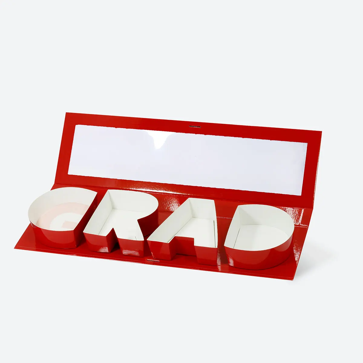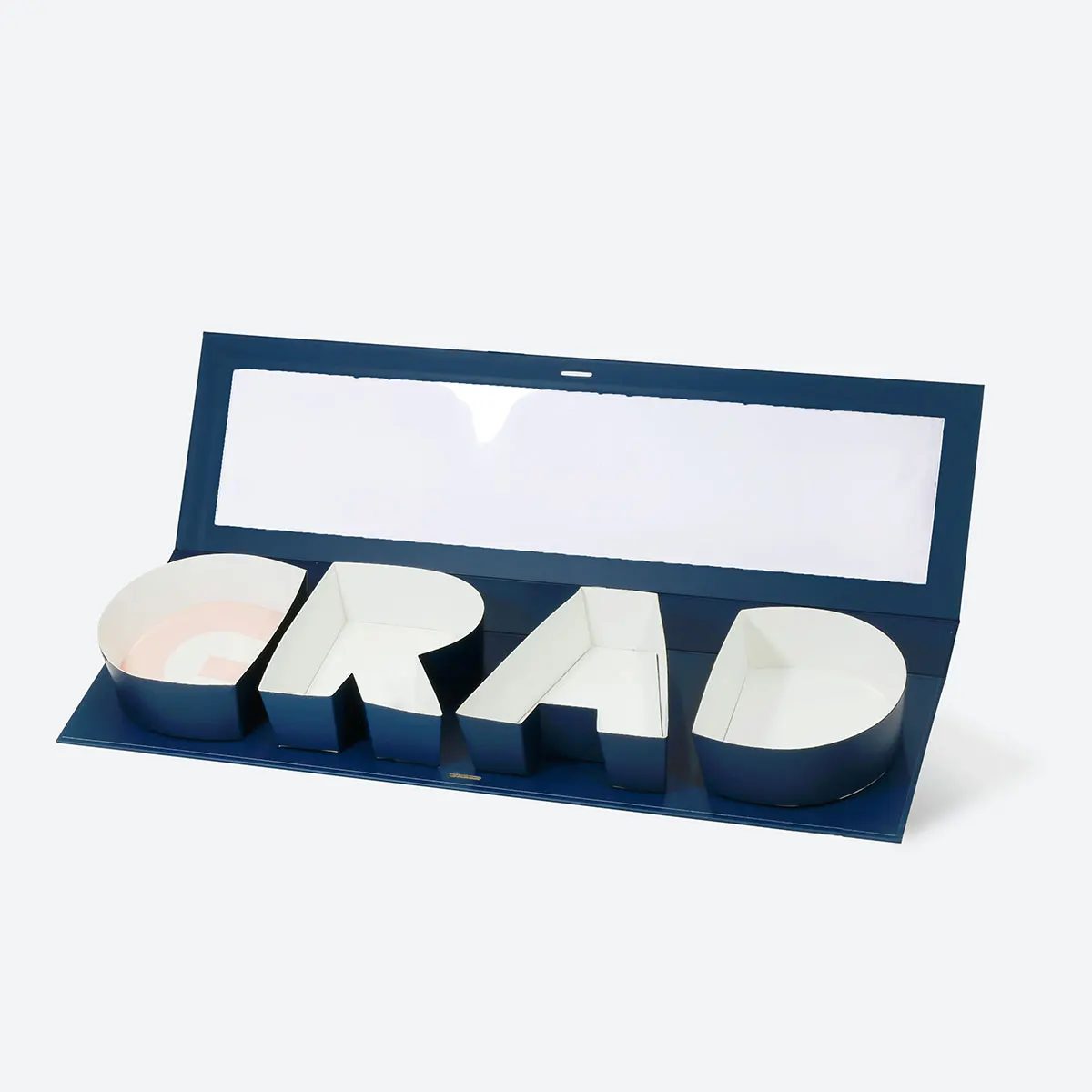 La boîte cadeau en forme de lettre GRAD est un cadeau parfait pour la fête des pères. Elle peut être changée en 4 lettres composées, ce qui permet une personnalisation unique. La boîte est disponible en plusieurs couleurs : blanc, noir et bleu marine.