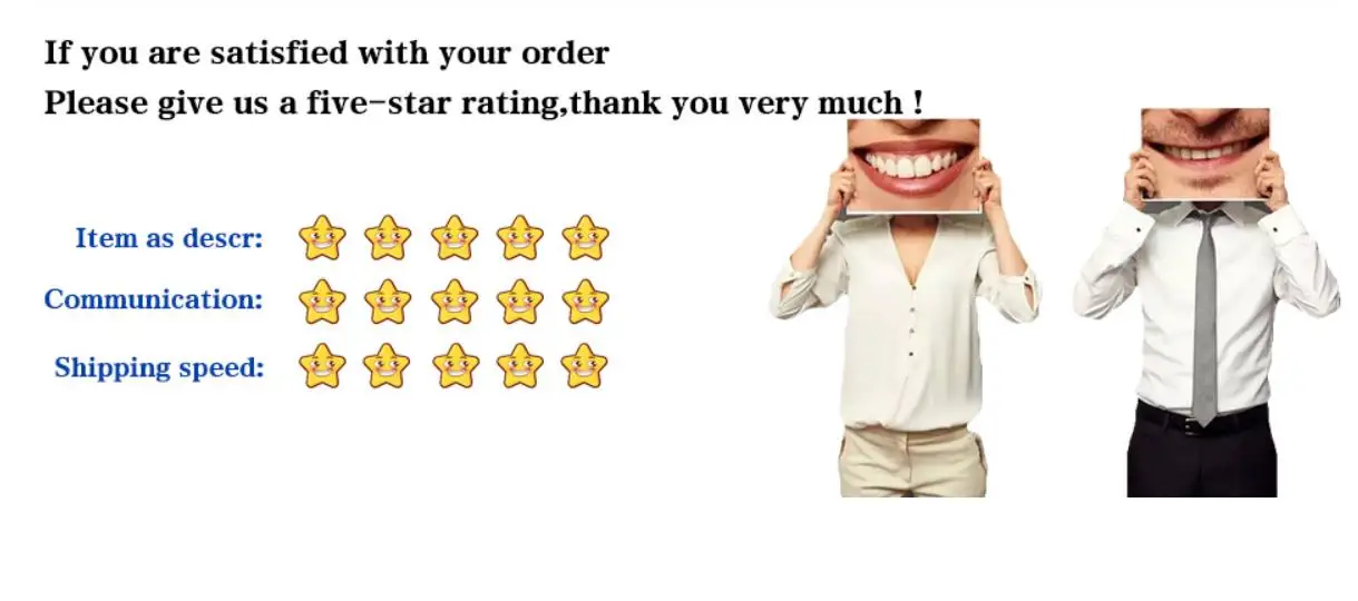 1. Veuillez laisser un commentaire 5 étoiles si vous êtes satisfait de nos produits et services, nous l’apprécierons (Article conforme à la description 5 étoiles, Communication 5 étoiles, Livraison dans les délais 5 étoiles).