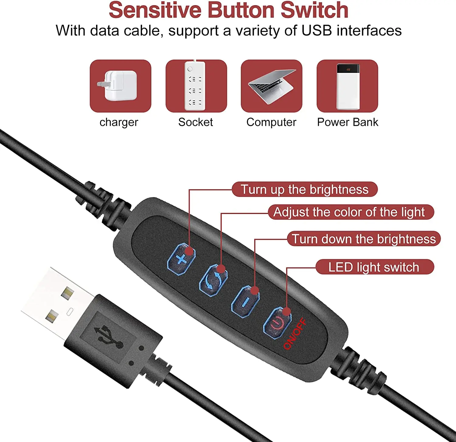Les lumières LED sont alimentées par un adaptateur DC 5V 2A.