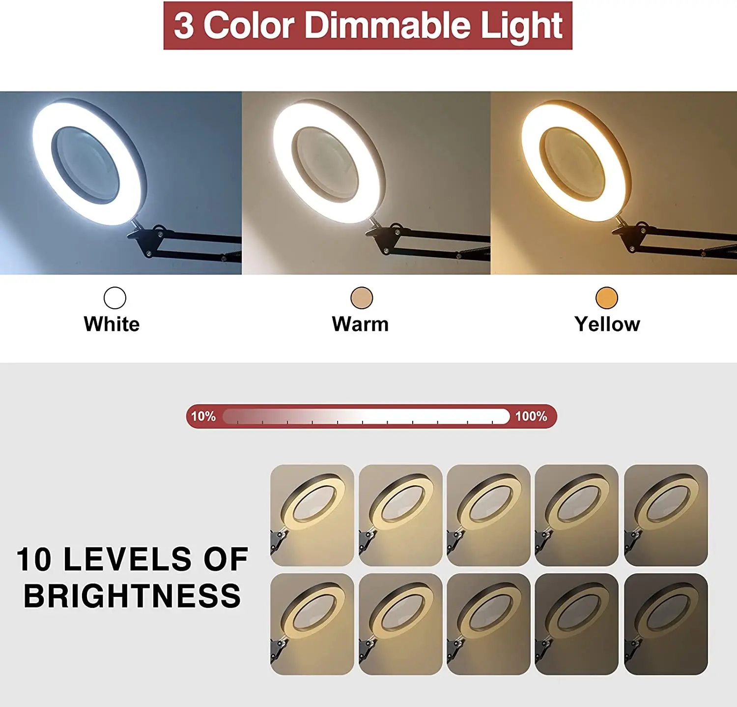 La loupe est équipée de lumières LED qui peuvent être ajustées en 3 étapes de température de couleur et en 11 étapes de luminosité. Vous pouvez donc adapter l’éclairage à différents environnements de travail.