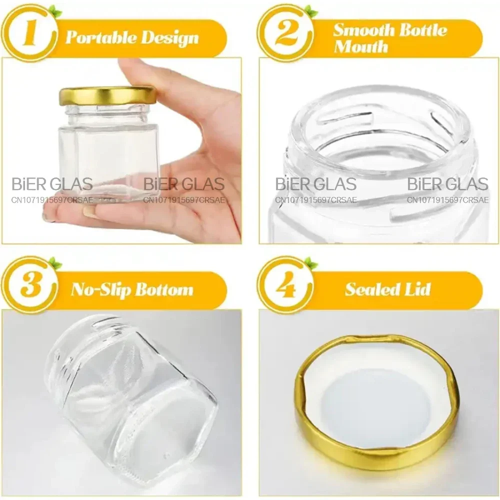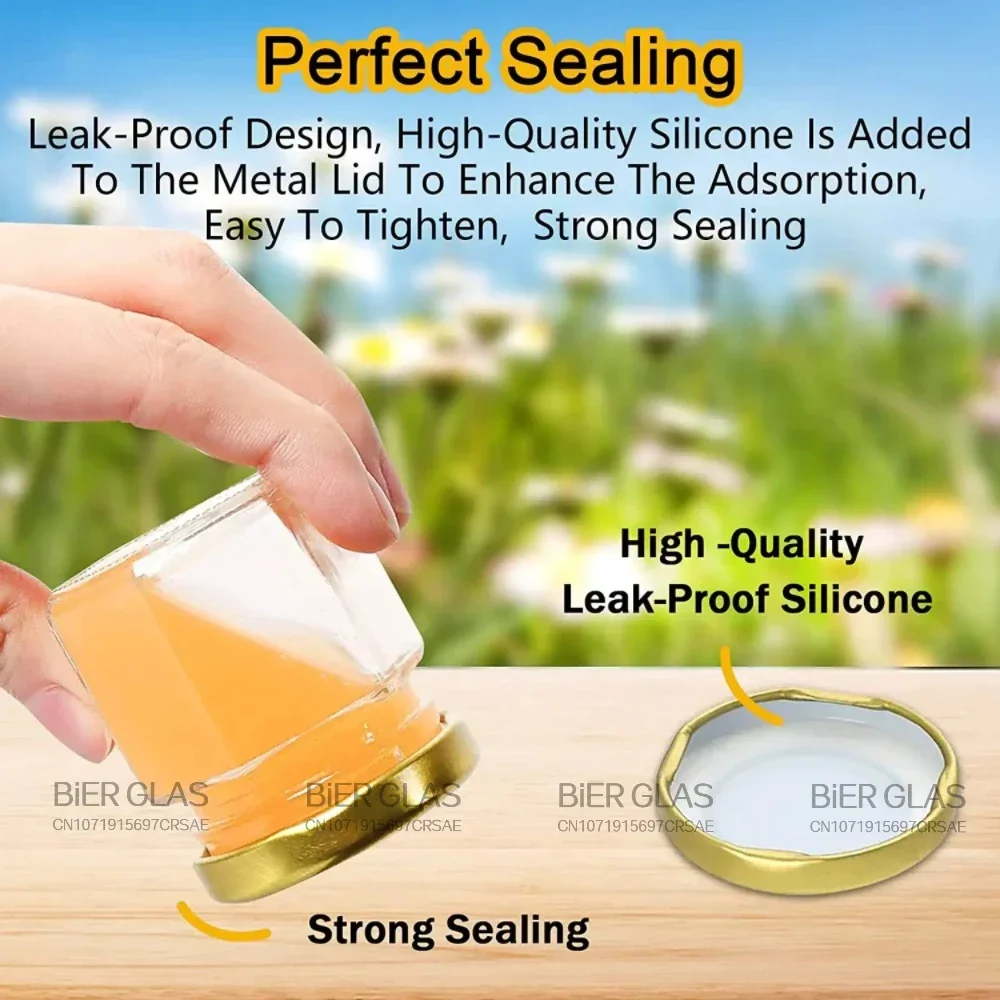 Les mini pots à miel en verre précieux sont parfaits comme cadeaux pour vos invités lors d’événements tels que les baptêmes, les anniversaires ou les mariages. L’ensemble comprend des pots en verre de 45ml avec des couvercles, des pendentifs d’abeilles et des louches en bois. Les couvercles dorés ajoutent une touche d’élégance. Les pots sont en verre sodo-calcique sans plomb et les couvercles en étain sans BPA. Ils conviennent à la mise en conserve domestique et au bain d’eau chaude, sont de qualité alimentaire et peuvent être lavés au lave-vaisselle. Ils sont également emballés dans une boîte en mousse personnalisée pour garantir leur sécurité pendant le transport.