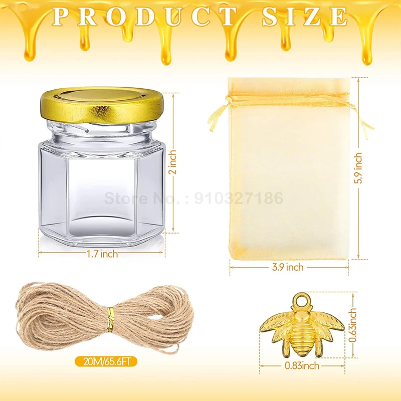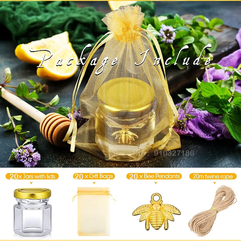 Cet ensemble de mini pots à miel en jute est un choix idéal pour les cadeaux de mariage, les fêtes et les vacances. Il comprend 20 bocaux en verre, 20 couvercles dorés, 20 pendentifs en or et 20 louches en bois. Les bocaux en verre sont fabriqués à partir de verre sans plomb de haute qualité et les couvercles sont en métal sans BPA. La taille des pots est de 2 pouces de haut x 1-3/4 pouces de large. Ils sont parfaits pour contenir du miel ou d’autres petites surprises.