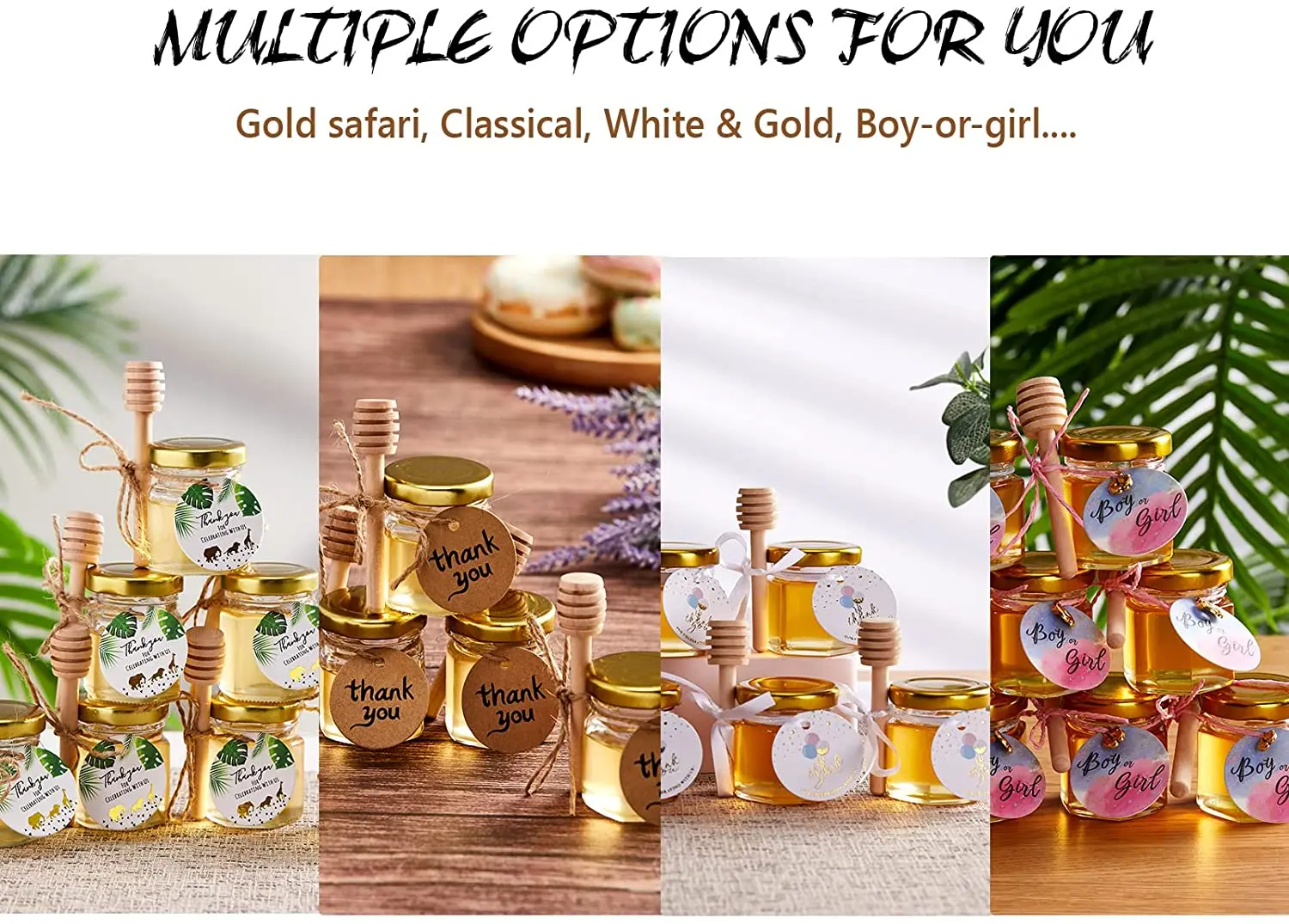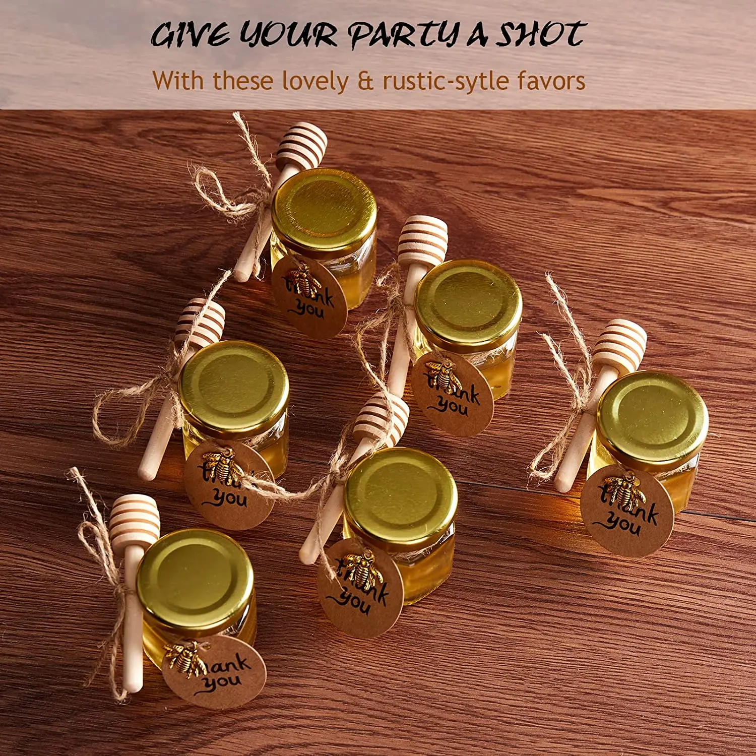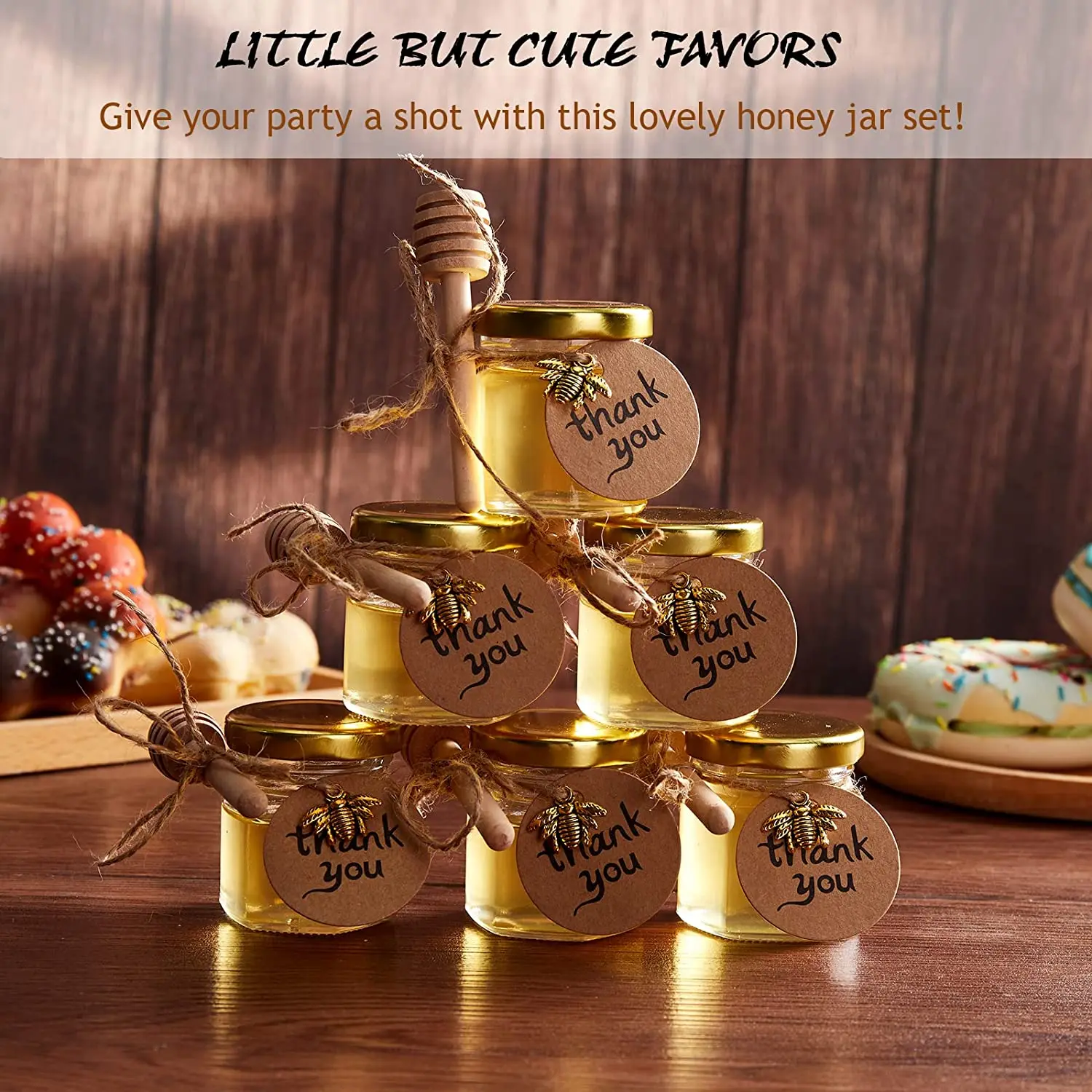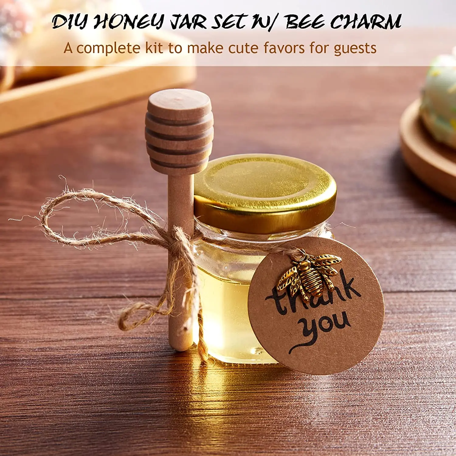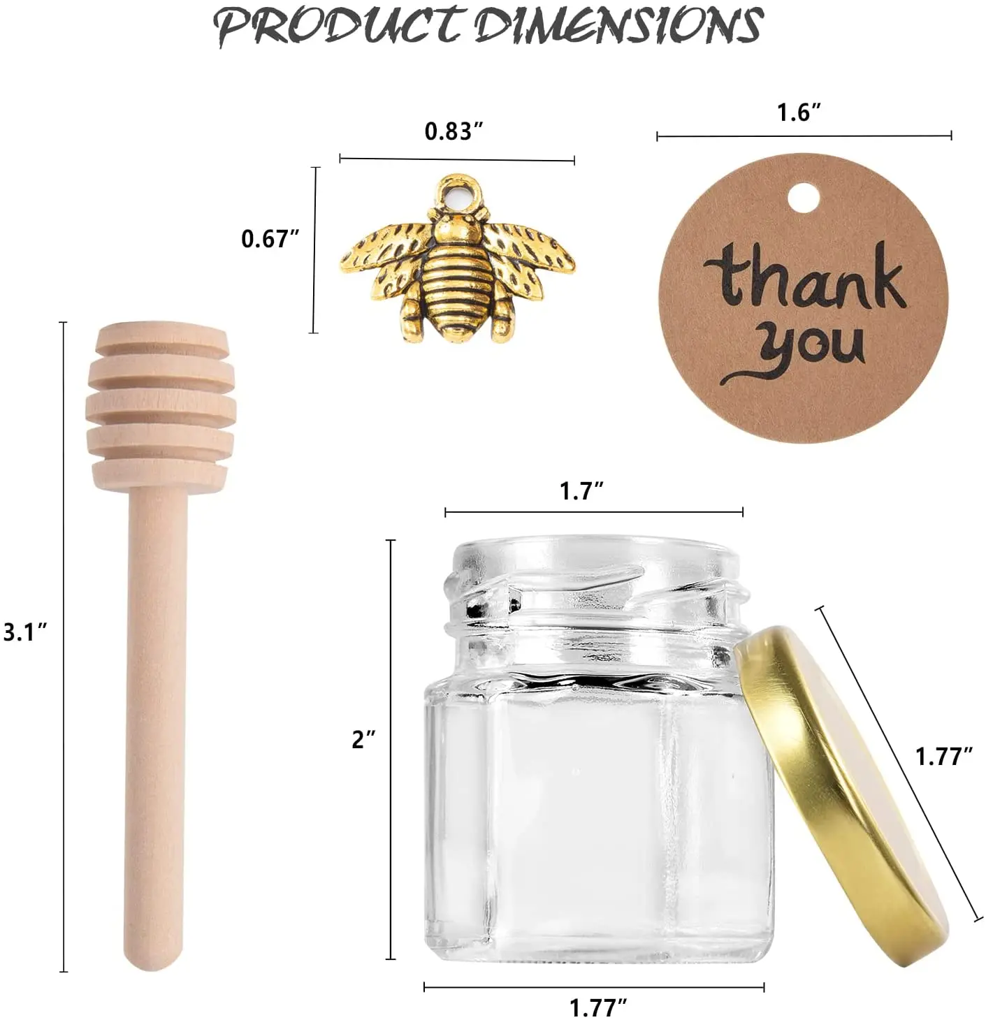 - Ensemble inclus : bocaux en verre de 1.5 oz avec couvercles, bouchons en or, pendentifs d’abeilles, louches en bois et ficelle