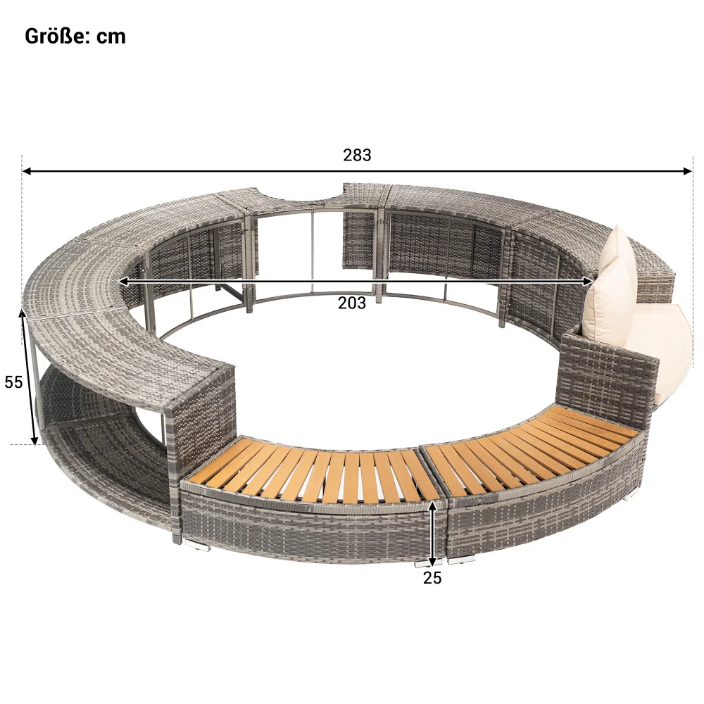 Les dimensions du produit sont : diamètre intérieur 203 cm, diamètre extérieur 283 cm, hauteur de la structure 55 cm, hauteur d’assise en bois d’acacia 25 cm.
