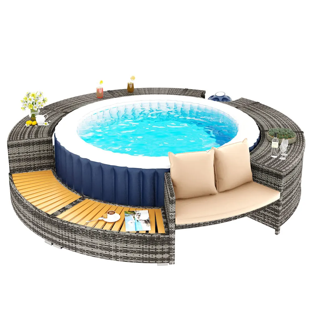 Le Mobilier de jardin de piscine spa Premium, rotin gris PE et bois d’acacia avec rangement est fabriqué avec un cadre en fer, du rotin gris PE résistant aux UV et du bois d’acacia solide, offrant ainsi une durabilité et une résistance aux intempéries. Le rotin PE gris est non seulement facile à entretenir, mais il apporte également une touche élégante et moderne à votre espace extérieur.
